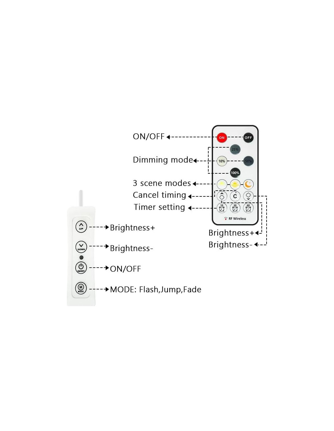- Iluminación regulable: Viene con control remoto RF y controlador (receptor), tiene función de memoria. 3 funciones de temporizador (10min/30min/60min) pueden hacer que la tira de luz se apague a la hora establecida. aumento/disminución de brillo (6 niveles) y 4 niveles de brillo fijo (10%/25%/50%/100%), 3 modos (salto, degradado, parpadeo).