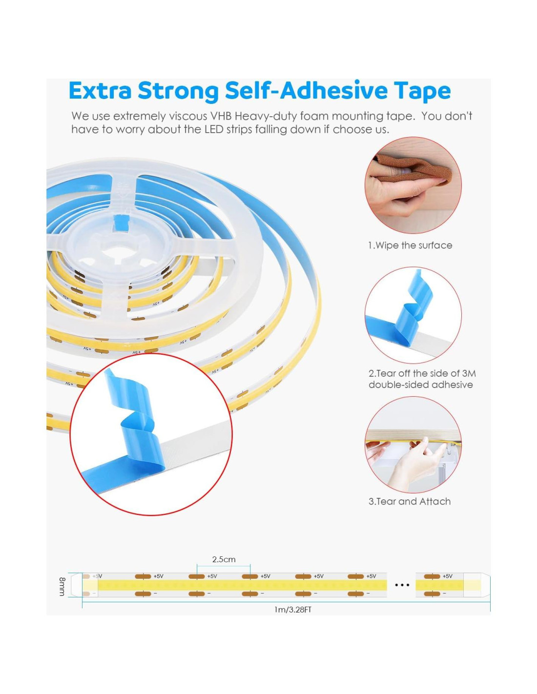 - Uso Amplio: Con una cinta adhesiva fuerte en la parte posterior de la cinta COB de 8mm de ancho, puedes instalarla fácilmente en lugares estrechos, como debajo de gabinetes, sofá, armario, luz de fondo de TV. Es mejor mantener la superficie limpia/seca/ lisa antes de la instalación.