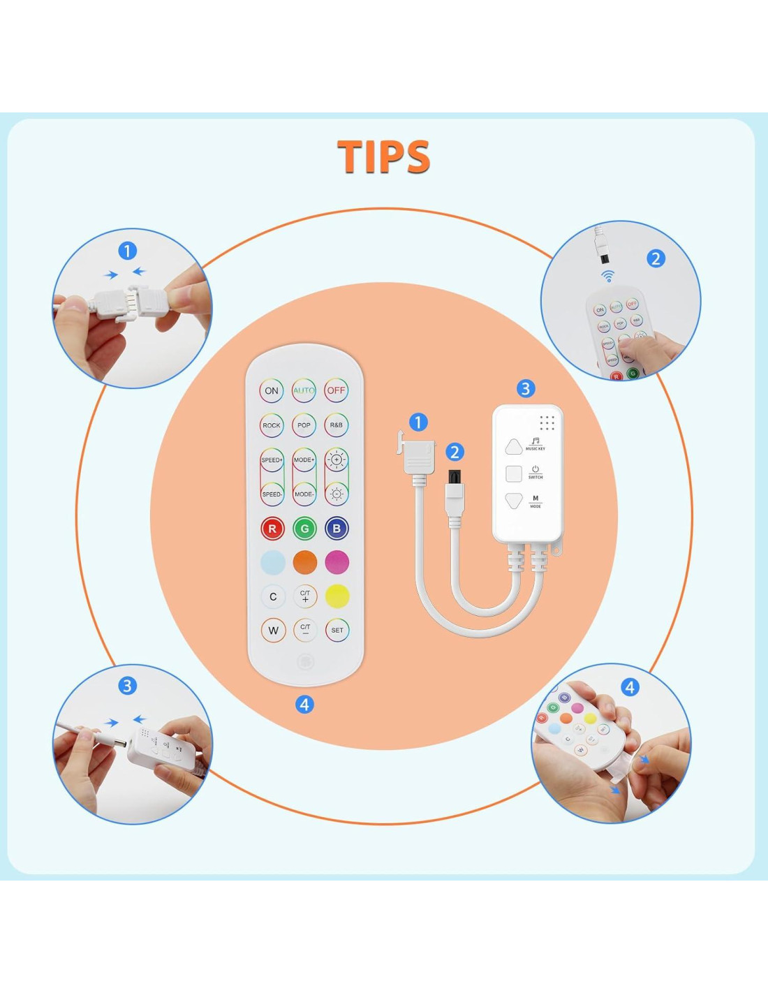 - Tres Métodos de Control: Soporta control por APP de smartphone, control remoto IR y caja de control de 3 botones. Puedes elegir cualquier brillo y cualquier color a través de la APP. El control remoto con 3 modos de música integrados se puede cambiar a voluntad, ROCK/POP/R&B. Soporta función de ajuste de blanco. Cuando presionas el botón "C" o "W", puedes ajustar la luz blanca presionando C/T+ o C/T-, similar a 2700K a 6500K.
