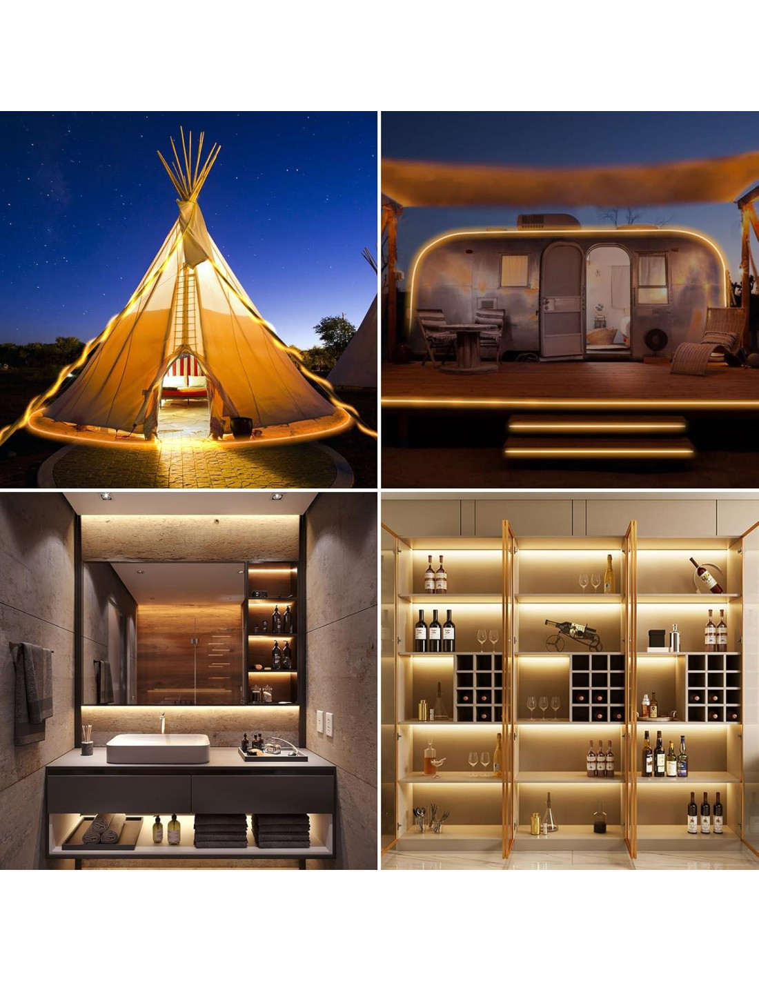- Uso amplio: Esta iluminación de tira a prueba de agua es segura y tocable, perfecta para iluminación interior y exterior: cocina, dormitorio, apartamento, dormitorio, estante, escaleras, tienda, debajo de los gabinetes, closet, sofá, TV, dormitorio, muebles, iluminación de sótano