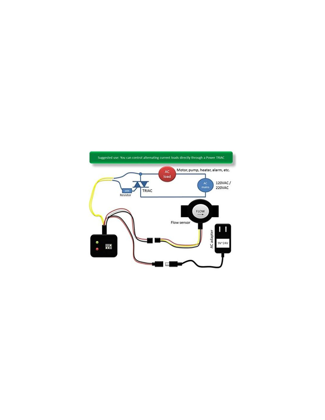 Detector de flujo para sensores de efecto Hall JDH FlowSwitch. Solución simple que permite controlar una carga de corriente alterna a partir de la detección de un cierto flujo de líquido. Ideal para iniciar un motor, un sistema de bombeo, un calentador, una alarma, etc. Uso sugerido: Puede controlar cargas de CA directamente a través de un TRIAC externo (no incluido). Características de JDH FLOWSWITCH: Salida aislada de optoTRIAC adecuada para cargas de 120VAC o 220VAC. Umbral de flujo ajustable en 8 niveles. Alimentación de 9 a 24 VDC. Conector universal compatible para sensores de flujo de efecto Hall. Características del Opto TRIAC (MOC3023): Voltaje de aislamiento: 5000V RMS. Voltaje máximo en estado apagado: 400V. Voltaje máximo en estado encendido: 3V (carga de 100mA). Corriente de mantenimiento: 250uA. Compatible con nuestra línea de sensores de flujo para tuberías de 1/2 pulgada a 3 pulgadas. Pregunte por la compra del paquete con sensor de flujo, TRIAC y adaptador de 9V/1A.