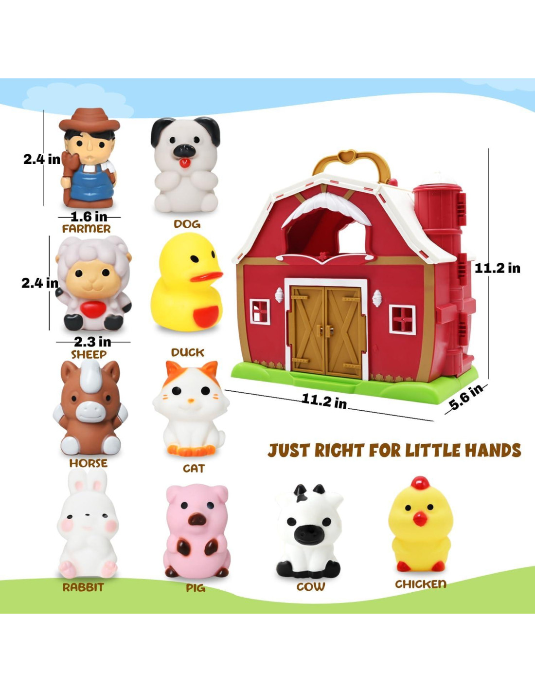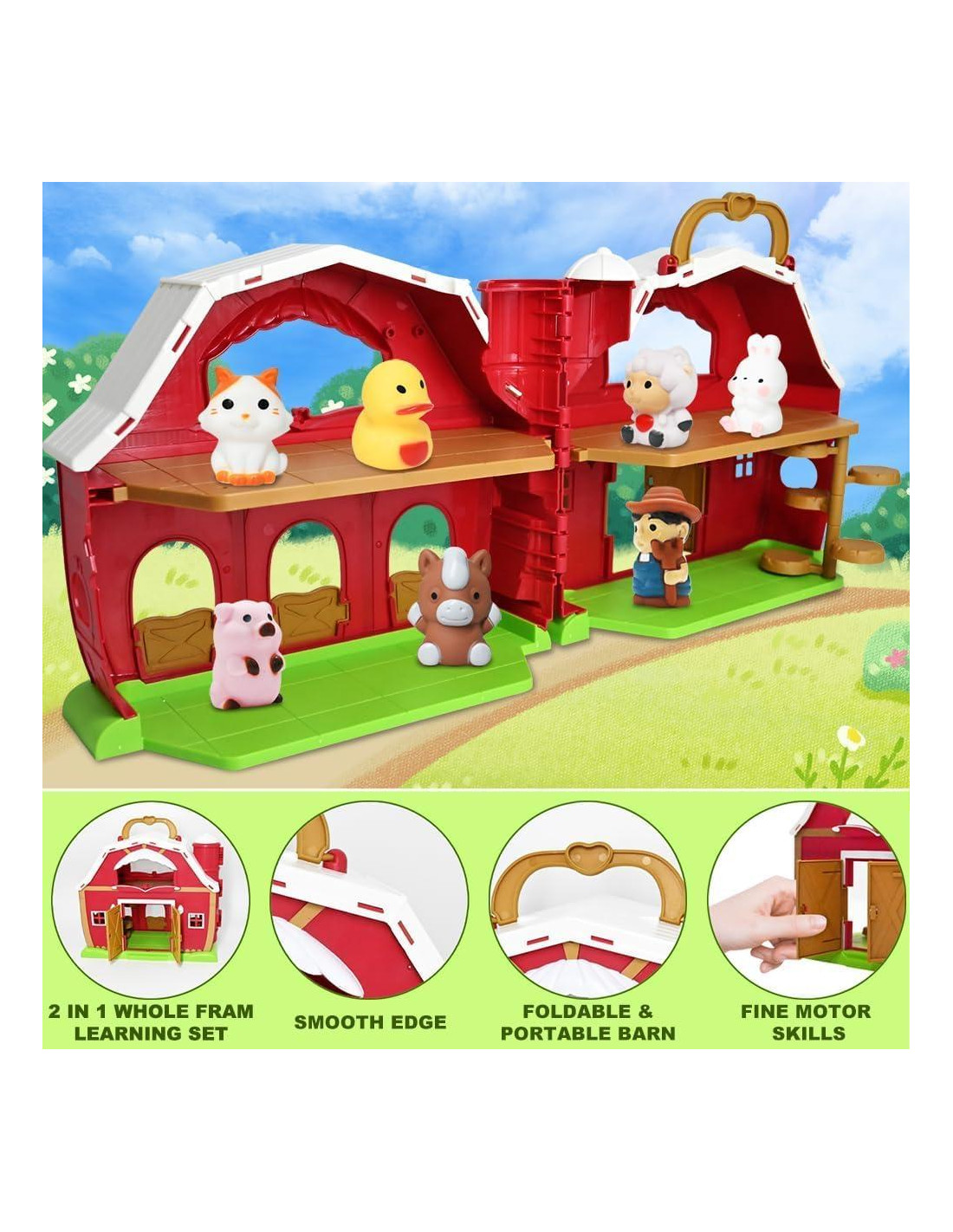 - PAQUETE DE VALOR: Los juegos de juguetes de establo rojo vienen con un gran establo de dibujos animados rojo, 1 granjero y 9 animales de granja. Las figuras de animales incluyen vaca, oveja, caballo, cerdo, conejo, gallina, pato, gato y burro.