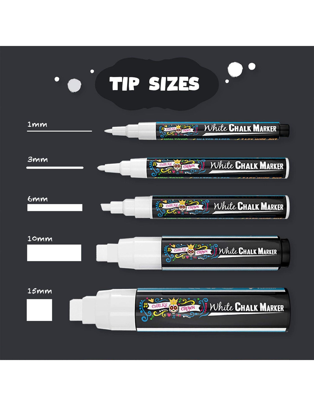 En Chalky Crown, creemos que todo lo que necesitas es un poco de curiosidad y las herramientas adecuadas, ¡y estás listo para comenzar! Creemos que las artes y manualidades pueden ser un espacio para relajarse, expresarse e incluso compartir un momento con tus seres queridos, y queremos ayudarte a disfrutar ese momento con productos confiables y asequibles. Damos la bienvenida a cualquiera que ame las ideas brillantes y los colores vivos. Hecho para Todos - Ya seas un Artista, Niño o Maestro, estos son los marcadores de tiza que estás buscando. Divertido y Fácil de Usar - ¡Es hora de reemplazar la vieja tiza polvorienta con marcadores de tiza líquida de color neón no tóxicos! Funciona genial con frascos de mason, cajas de juguetes, almacenamiento de despensa, proyectos de manualidades, contenedores y muchas otras cosas. ¡Crea diseños increíbles con los diferentes tamaños incluidos! Hecho para cada estilo y ocasión. Los Marcadores de Tiza Blanca están formulados con materiales no tóxicos, lo que los hace seguros para ser usados por cualquier persona. Cuando estés listo para escribir y comenzar de nuevo, un simple roce con una toalla de papel húmeda eliminará tus marcadores de tiza borrables por completo y fácilmente.