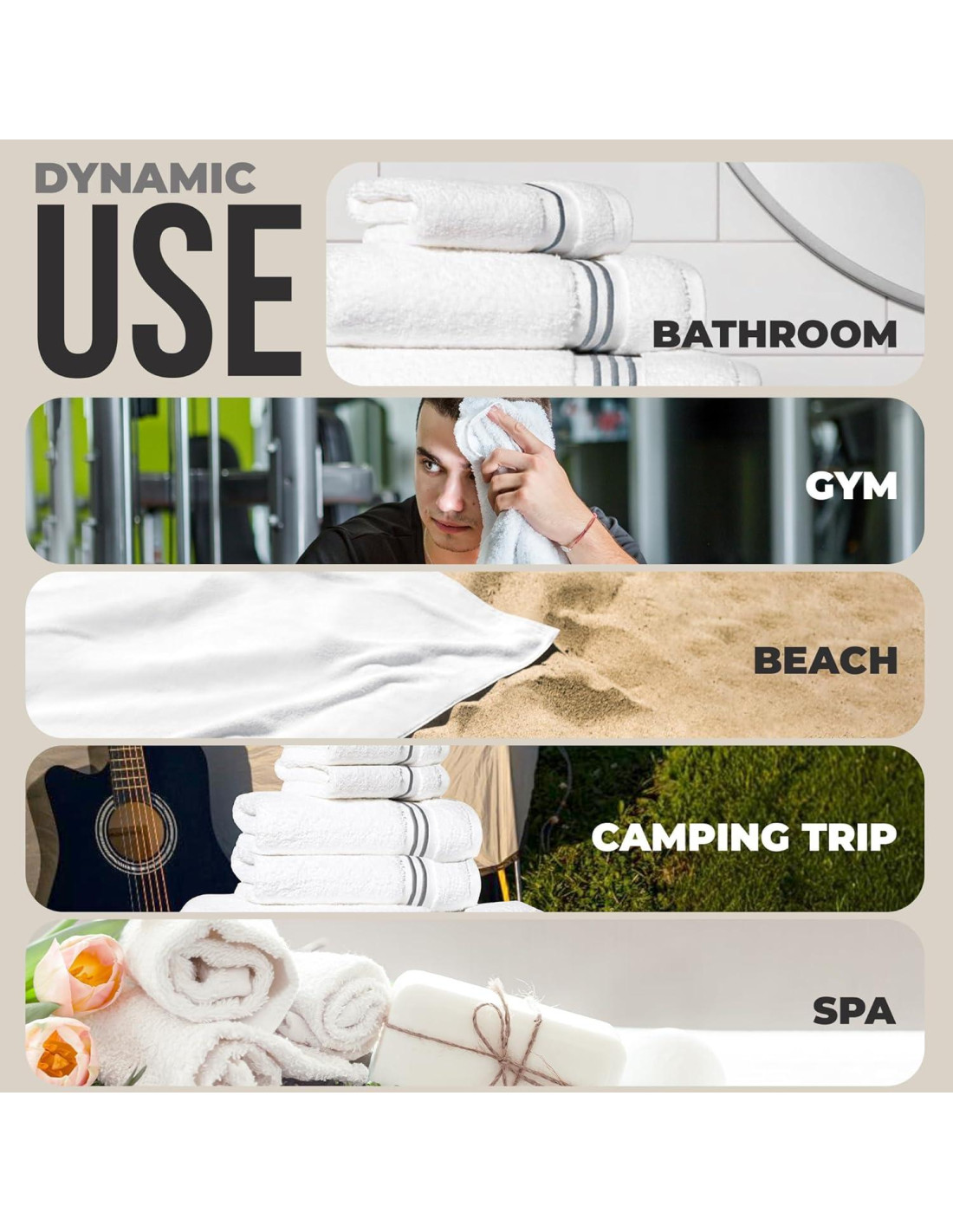 - USO MULTIFUNCIONAL/VERSÁTIL/ DINÁMICO- Combinación perfecta de suavidad y fuerza, el juego de toallas es ideal para el uso diario. Usa las toallas de manera eficiente en un baño, en el gimnasio, en la playa, al borde de la piscina, en un salón, spa o incluso en un viaje de camping.