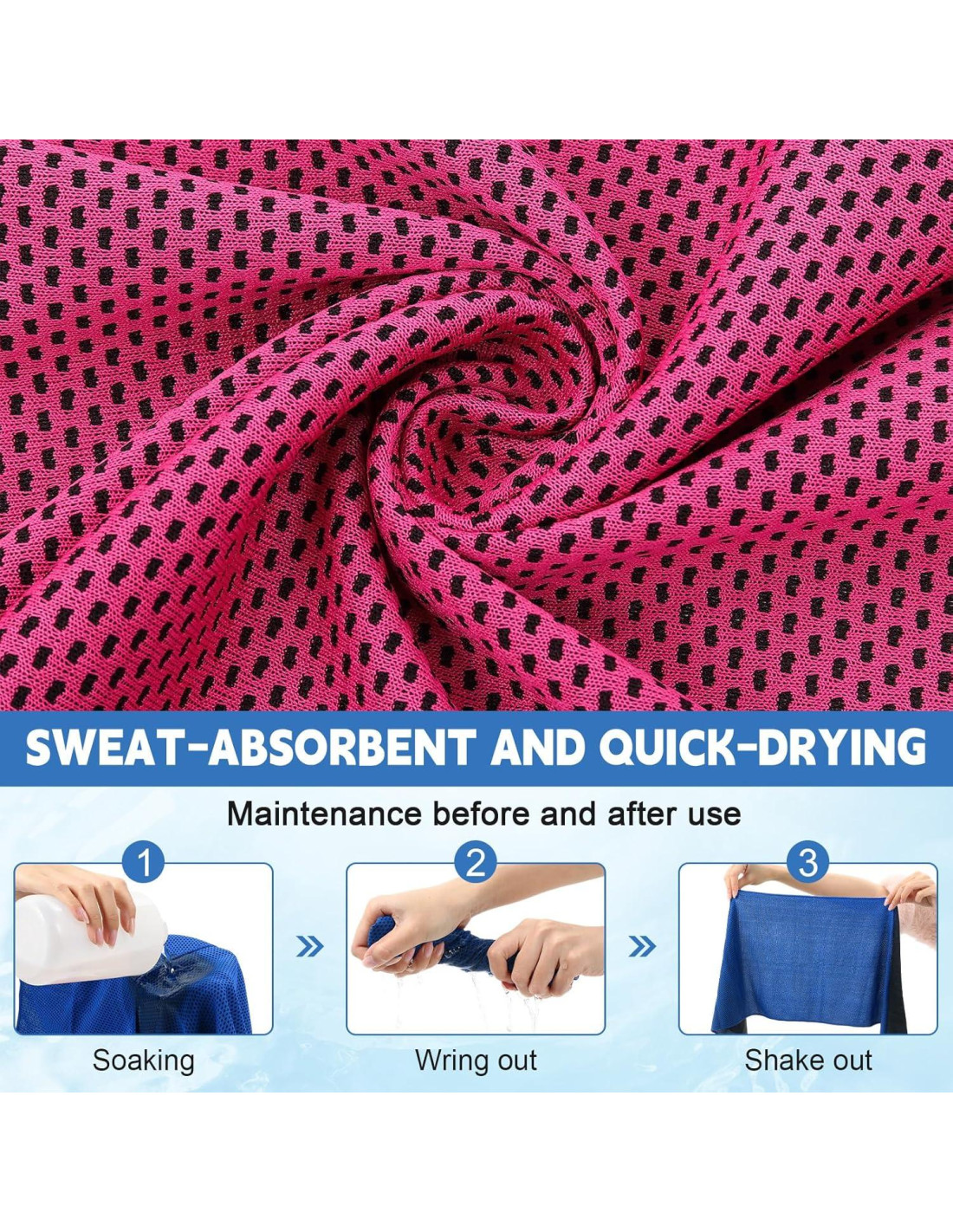- Enfriamiento Rápido y Reutilizable: cada toalla de enfriamiento tiene la capacidad de enfriarse rápidamente una vez sumergida en agua y exprimida; Sus características permiten que el efecto de enfriamiento dure horas, y se puede reutilizar simplemente repitiendo este proceso