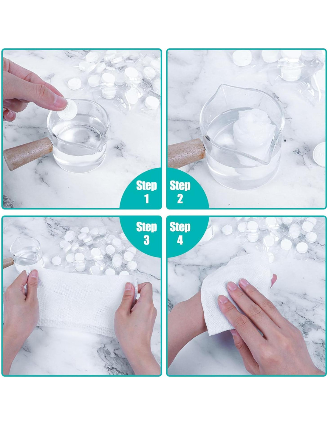 - APLICACIONES VERSÁTILES - Nuestras tabletas de toalla se pueden usar para limpiar gafas, mesas de comedor, automóviles; son adecuadas para vendajes de heridas y eliminación de maquillaje, entre otros usos. Higiénicas y seguras; perfectas para varios entornos como cocinas, hoteles, salones, baños, oficinas, senderismo, camping y viajes.