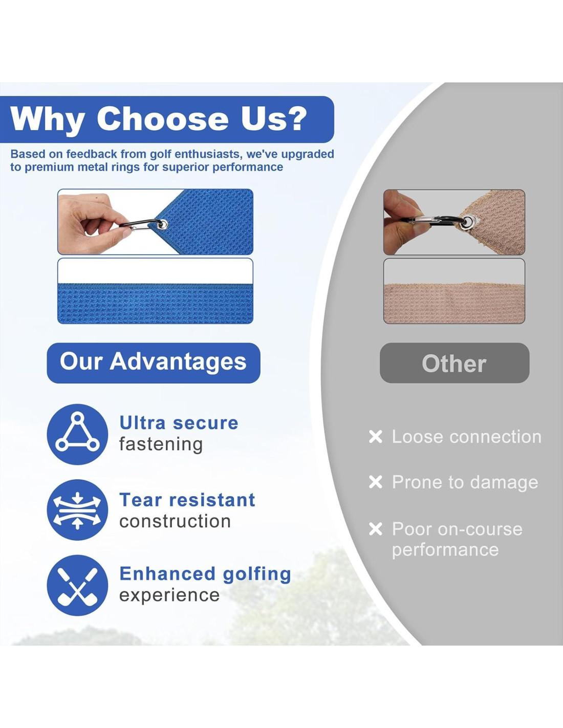 - Mosquetón Multifuncional: Cada toalla de golf para hombres está equipada con un mosquetón de aluminio que se puede adjuntar fácilmente a una bolsa de golf, cinturón o carrito de golf, lo que lo hace muy conveniente de usar y llevar. Esta característica mejora la flexibilidad y conveniencia de la toalla en el campo, ahorra espacio en la bolsa de golf y previene que la toalla se pierda.