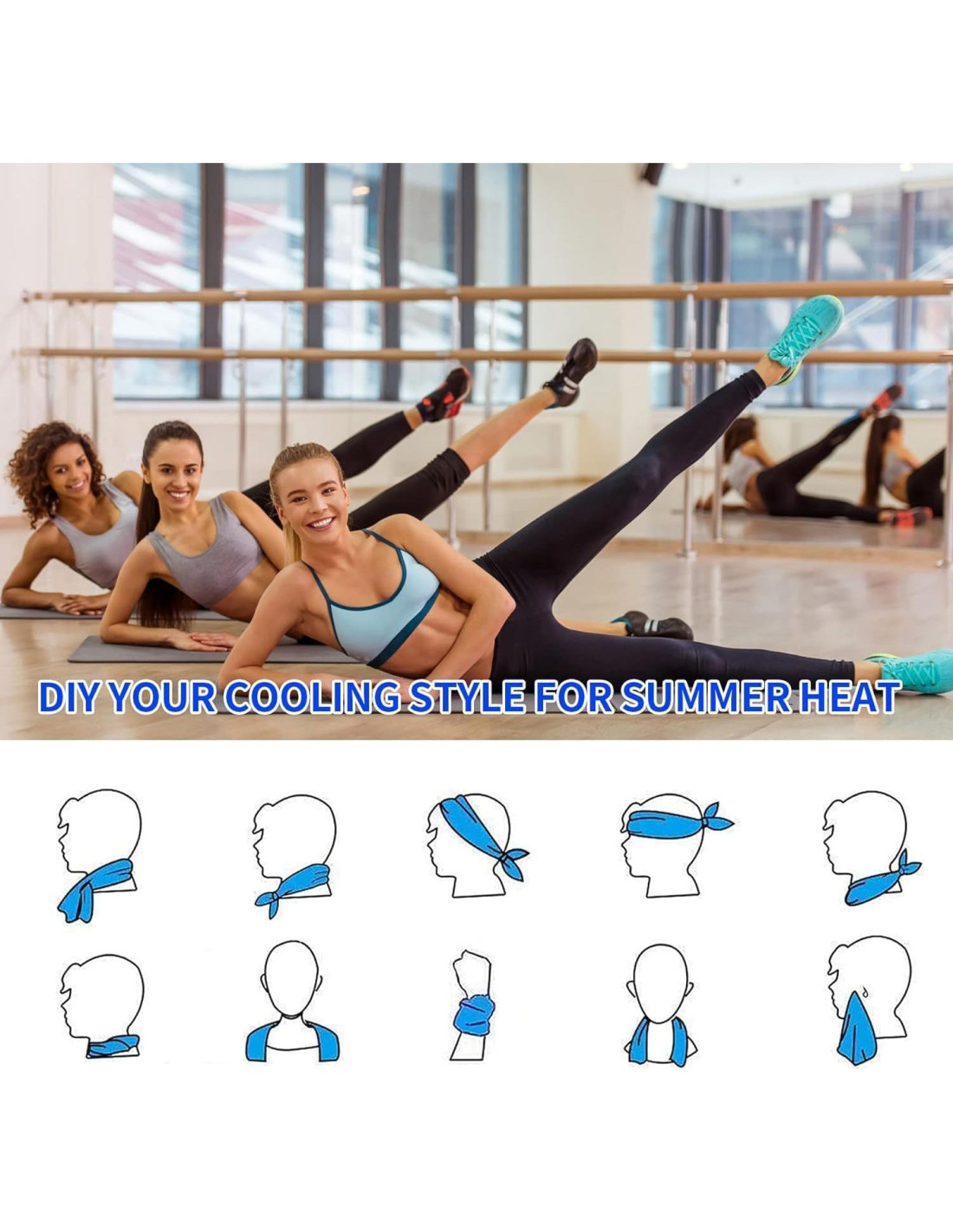- Múltiples Usos y Aplicaciones: La toalla enfriadora se puede usar en tu cabeza, cuello, cara, hombros o donde quieras sentirte fresco. Úsala como toalla de sudor, protector solar, envoltura para el cuello o incluso como una mini manta enfriadora. ¡Perfecta para atletas, viajeros y trabajadores al aire libre!