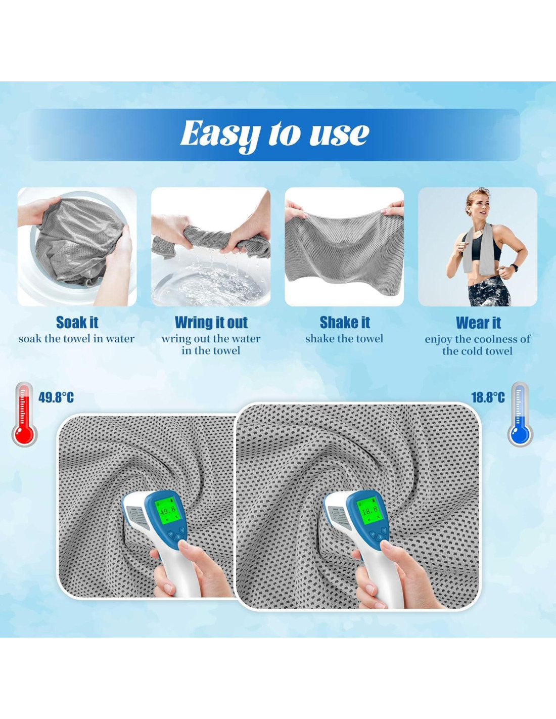 - OBTÉN UN "PEQUEÑO AIRE ACONDICIONADO" FÁCILMENTE - El efecto de enfriamiento de la toalla enfriadora se puede activar en solo tres pasos. Primero, sumerge la toalla de yoga completamente en agua fría, luego escurre el agua y finalmente sacude la toalla fría tres veces. Repite esto muchas veces para obtener un "pequeño aire acondicionado" que te mantenga fresco todo el día. Colócala en las partes calientes de tu cuerpo para disipar instantáneamente el calor y darle a tu piel una ligera frescura.