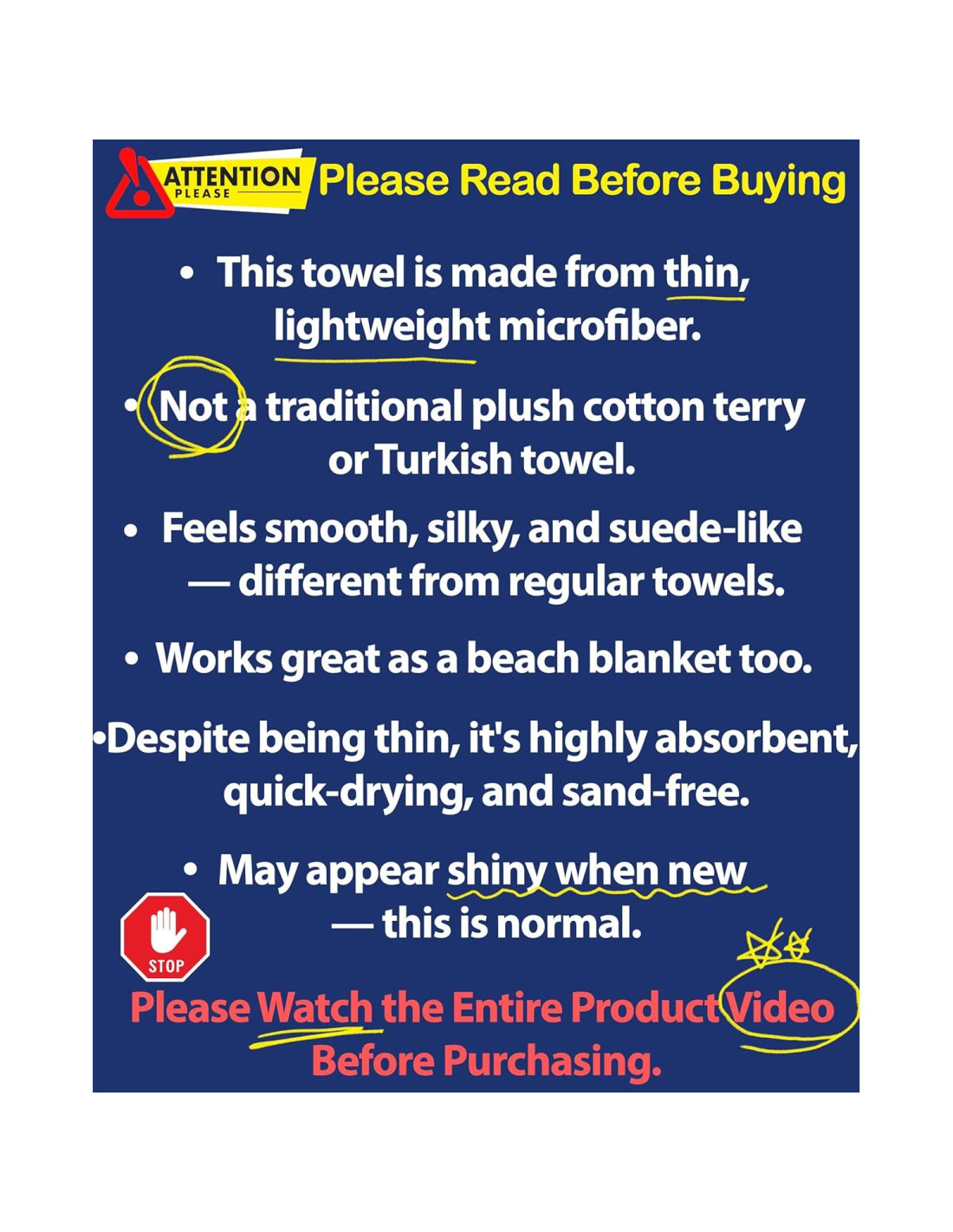 - ATENCIÓN POR FAVOR: Lea antes de comprar. Esta toalla está hecha de microfibra delgada y ligera, no es una toalla de algodón tradicional ni una toalla turca. Tiene una sensación suave, sedosa y similar al ante que puede ser diferente a lo que estás acostumbrado. A pesar de su delgadez, es altamente absorbente, de secado rápido y libre de arena. También es una manta de playa perfecta. Nota: Puede parecer brillante al principio, pero se suaviza a una textura de ante después del primer lavado. Brillante cuando es nueva: Debido a las fibras suaves y densamente tejidas. Similar al ante después del lavado: Las fibras se suavizan y reducen el brillo, mejorando la suavidad y la textura. Esto es completamente normal y mejora la comodidad y la absorbencia de la toalla.