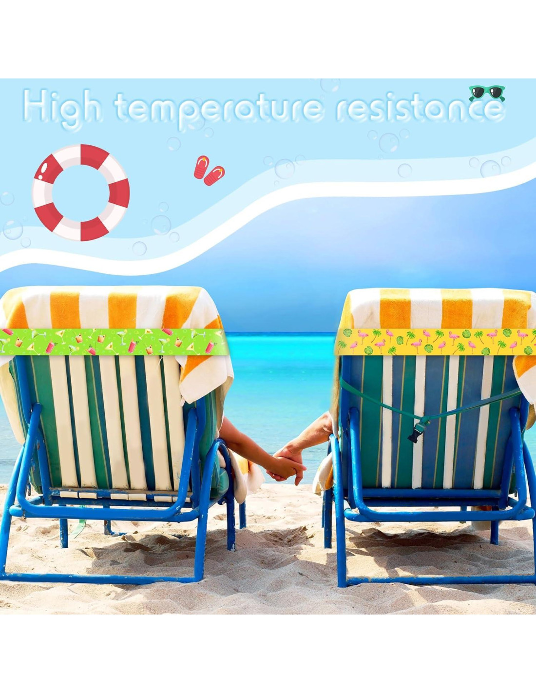 - Material Elástico: los soportes de toalla de playa están hechos de materiales de goma y poliéster, que son resistentes a la flexión y rotura bajo el sol, no necesitas preocuparte por que se rompan o se oxiden repentinamente, puedes usarlos fácil y cómodamente