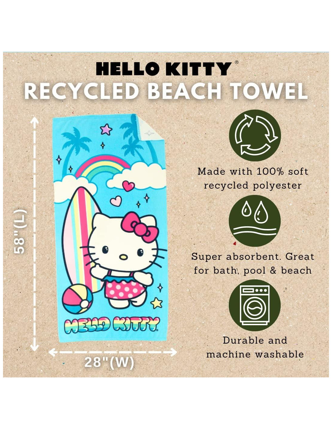 - DISEÑO DE HELLO KITTY: Lleva la querida gatita kawaii de Sanrio a tus rutinas de baño y natación con esta linda y colorida toalla de playa reciclada de Hello Kitty. Envuelve a tu hijo en comodidad y estilo juguetón con la ayuda del adorable patrón "Rainbow Surf" de esta toalla ecológica.