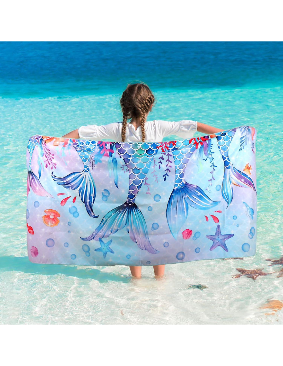 - DISEÑO DE SIRENA FANTÁSTICO: Nuestra toalla de playa de sirena presenta ilustraciones de colas de sirena, conchas marinas y estrellas de mar inspiradas en sueños y fantasía. Puedes disfrutar del brillante sol en la playa con esta adorable y juguetona toalla de playa de sirena. Es un accesorio de playa perfecto para niños y adultos.