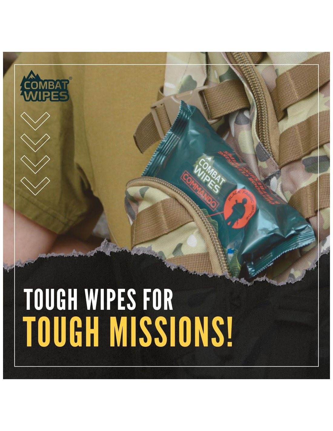- SUAVE CON LA PIEL: La composición de un paño NEGRO único y loción fue seleccionada después de extensas pruebas de laboratorio y experiencia en el campo de batalla. COMBAT WIPES COMMANDO son sin fragancia, sin alcohol, y tienen aloe y vitamina E para calmar mientras limpias.