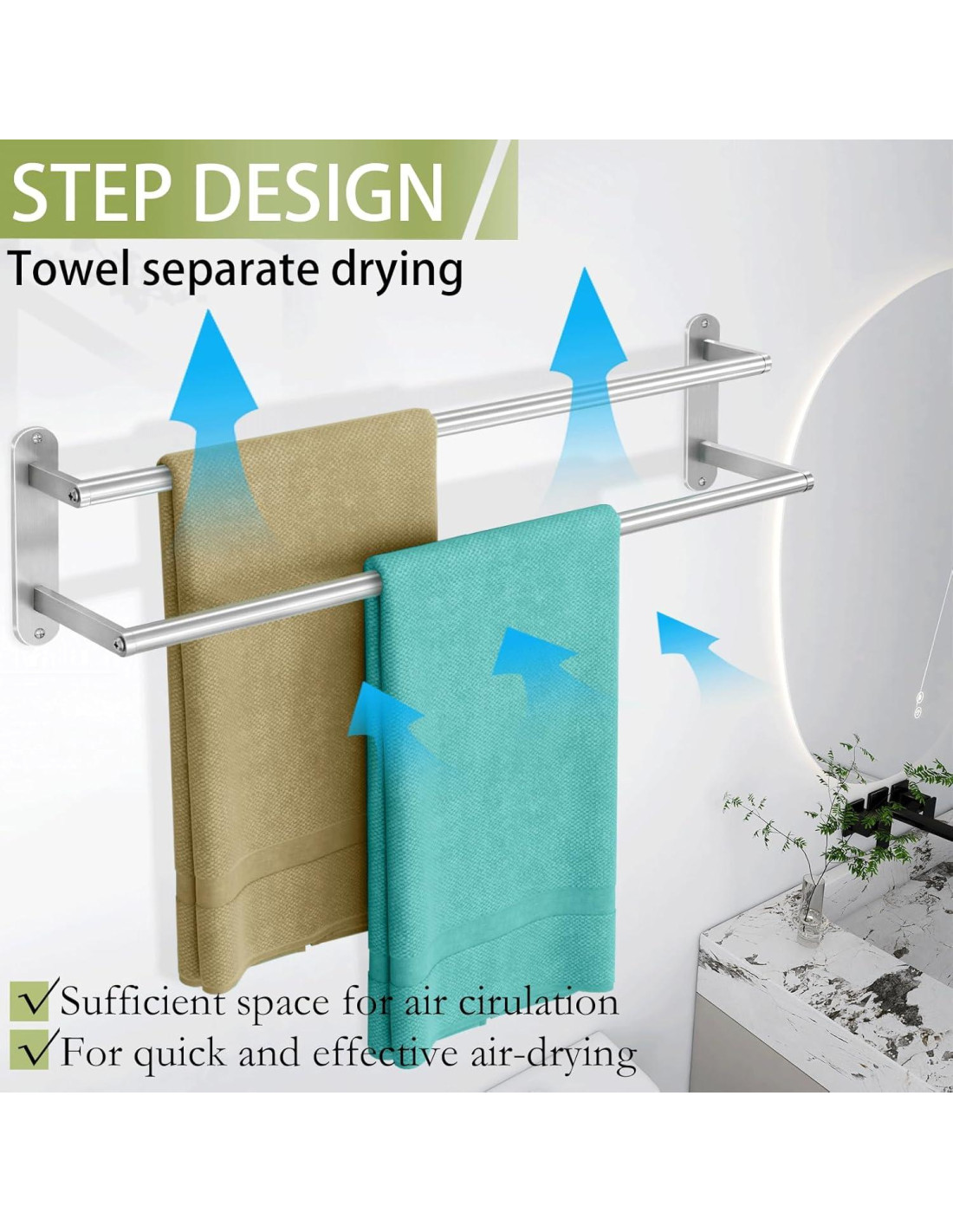 - DISEÑO EN ESCALERA - Barras altas y bajas escalonadas con suficiente espacio entre las dos barras para un fácil acceso a las toallas y un secado más rápido de las toallas. El soporte para toallas de baño maximiza el espacio y almacena el doble de espacio