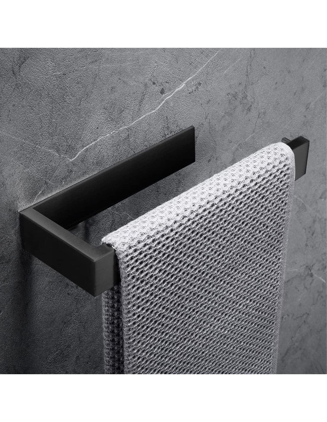 Hallyware es un fabricante profesional de productos para baño, cocina y jardín. Hemos estado comprometidos con productos de alta calidad durante muchos años, esperando brindar a los consumidores una mejor experiencia. Aquí encontrarás una serie de accesorios de baño para combinar con tu baño. Especificaciones Material: Acero Inoxidable SUS304 Color: Negro mate Dimensiones generales (L*D*H): 21.1 x 7.5 x 3 cm / 8.31 x 2.95 x 1.18 pulgadas Peso: 183 g / 6.46 oz Método de instalación: Autoadhesivo (sin perforación) Un buen material es la configuración básica de buenos productos. Usamos acero inoxidable SUS304 de alta calidad con acabado negro mate, que protege contra la corrosión, el óxido y el deslustre en la vida diaria. Nuestro adhesivo realmente tiene una viscosidad ultra fuerte, el soporte puede sostener hasta 5 kg / 11 lbs. Si necesitas cambiar la posición, simplemente retira la cinta adhesiva de doble cara original en el gancho calentándola con un secador de pelo y pega la nueva cinta adhesiva de doble cara en los ganchos para volver a colocarla. El brazo del rodillo de este soporte de toalla es de 21.1 cm / 8.31 pulgadas, con una apariencia simple y elegante, perfecto para tu baño, dormitorio, cocina, inodoro y otros espacios. Puede combinar mejor con cualquier tema de baño. Paquete incluye: Soporte de toalla x 1, Adhesivo x 2 Consejos: Diseño de una sola pieza, NO se requiere ensamblaje. Comuníquese con Hallyware para el reemplazo del paquete de hardware si no puede encontrarlo en el paquete. Asegúrese de que la superficie de la pared esté limpia y seca antes de la instalación. Retire la película protectora del pad adhesivo y pegue el producto en la superficie de la pared objetivo. Presione durante 5-8 segundos, el aire en exceso debe ser completamente expulsado de la pared. Finalmente, déjelo reposar durante 24 horas para asegurar una mejor adhesión y luego coloque las toallas. Gancho para abrigo Riel para toallas Estante para teléfono Material Acero inoxidable SUS 304 Material Acero inoxidable SUS 304 Material Acero inoxidable SUS 304 Color Negro mate Color Negro mate Color Negro mate Dimensiones del artículo (cm) 2.24 x 2.13 x 2.13 pulgadas Dimensiones del artículo (cm) 15.75*2.5*1.38 pulgadas Dimensiones del artículo (cm) 7.8*3.5*1.5 pulgadas Método de instalación Autoadhesivo Método de instalación Autoadhesivo Método de instalación Montado en la pared