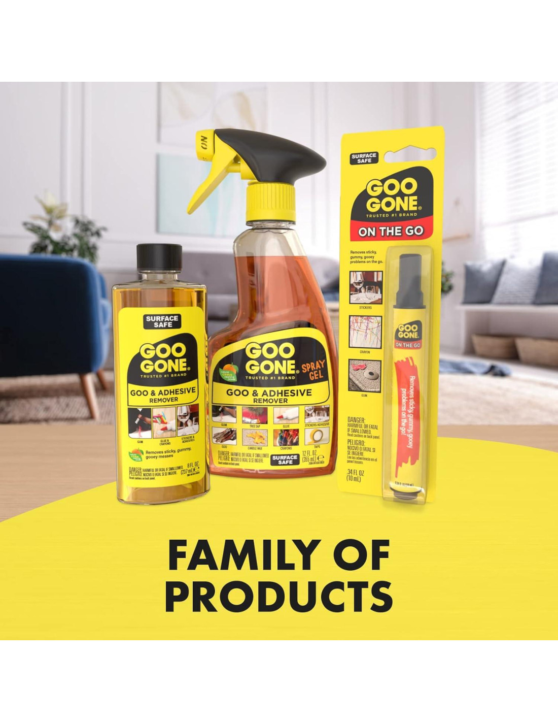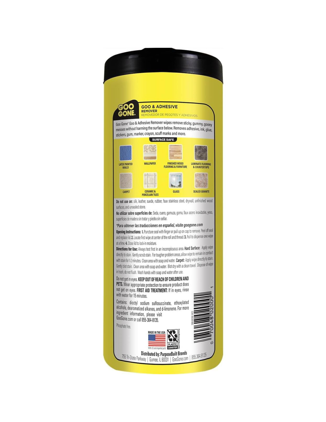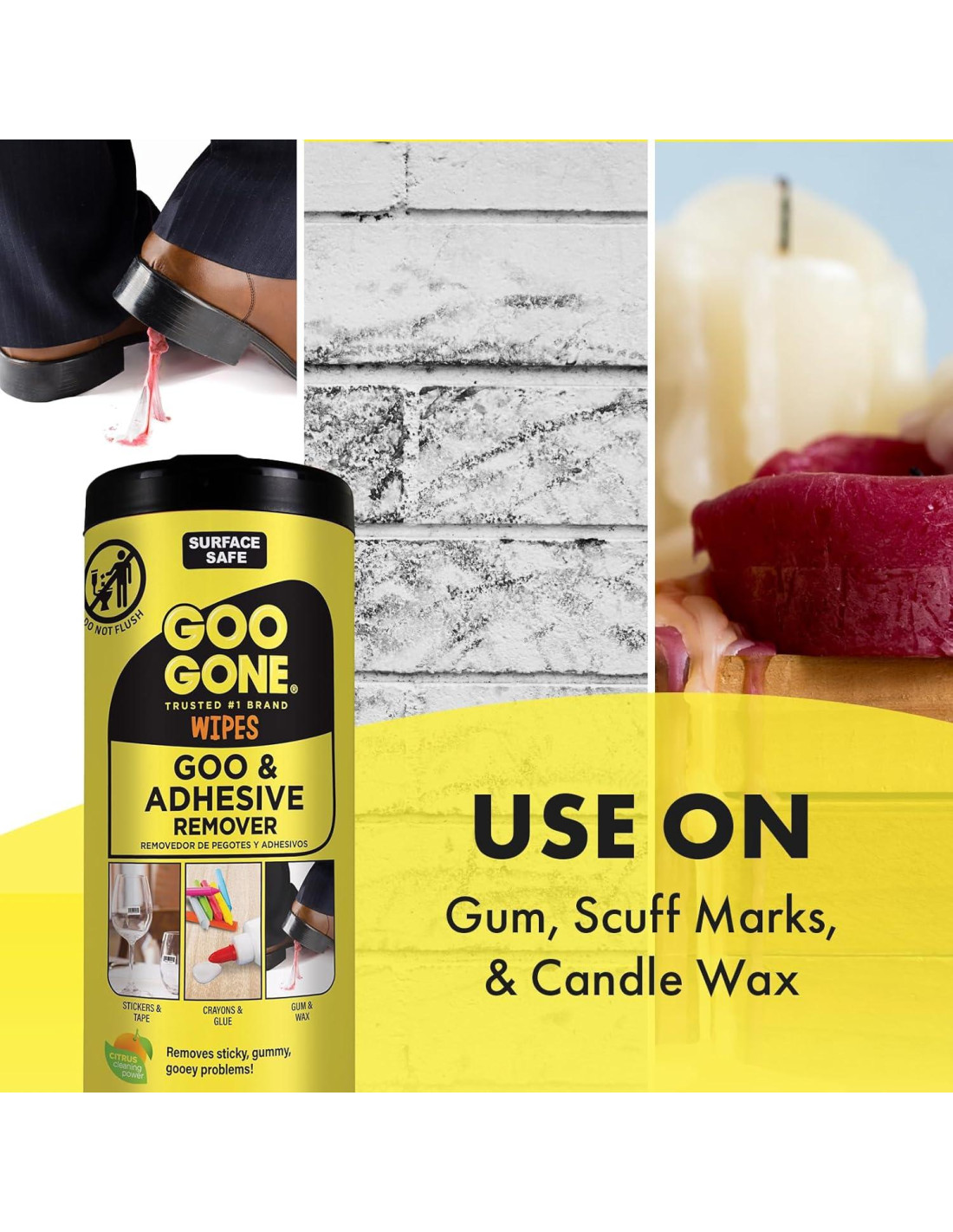 La línea de productos de Goo Gone es una marca de confianza, respaldamos nuestros productos para todos tus desordenes sucios y pegajosos. ¡Seguro para ti, tus superficies y tu hogar! Por favor explora nuestra línea de Goo Gone Original, Pro-Power, Multiusos, Elevador de Etiquetas, Gel en Spray, Patio, Parrilla, Horno, Automotriz, Azulejo y Lechada, Toallitas de Limpieza, Desengrasantes de Cocina, Pintura y más. Hay tantas maneras de eliminar desordenes difíciles con los productos Goo Gone. Formulado específicamente con Poder Cítrico, el portafolio de productos de Goo Gone limpia sin esfuerzo manchas y desordenes pegajosos en toda tu casa. Desde chicle hasta grasa, tela hasta fibra de vidrio, puedes contar con Goo Gone para eliminar de manera segura casi cualquier problema y restaurar tus superficies a su condición original. Si no puedes deshacerlo, des-pega-lo. Aprovecha el poder de Goo Gone, ahora en una toallita ultra conveniente. Cada toallita puede eliminar tus problemas pegajosos, gomosos y chicludos sin dañar tu superficie. La fórmula suave y no abrasiva es segura para uso diario. Las toallitas para tareas difíciles de Goo Gone son recomendadas para limpiar residuos de cinta de enmascarar, marcas de raspaduras, derrames de tinta, savia de árbol, pegatinas, chicle, pegamento, marcadores y crayones. Lo entiendes, Goo Gone es seguro para superficies, así que es una alternativa segura a limpiadores abrasivos que pueden dañar tus superficies. Siéntate y deja que Goo Gone se encargue de tus desordenes más difíciles.