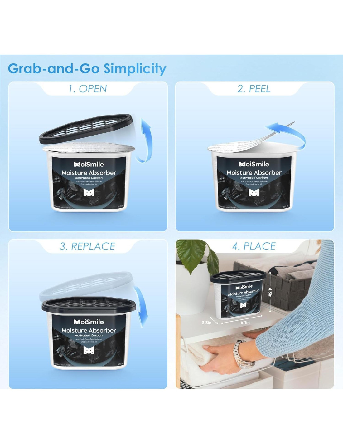 - Uso Portátil: Los absorbentes de humedad Moismlie para closet son portátiles y fáciles de usar, perfectos para closets, baños, autos y cuartos de almacenamiento. Con carbón activado, estos paquetes absorbentes de olores y desodorantes para closet no solo absorben humedad, sino que también eliminan olores, manteniendo los espacios frescos. No dude en contactarnos si tiene alguna pregunta.