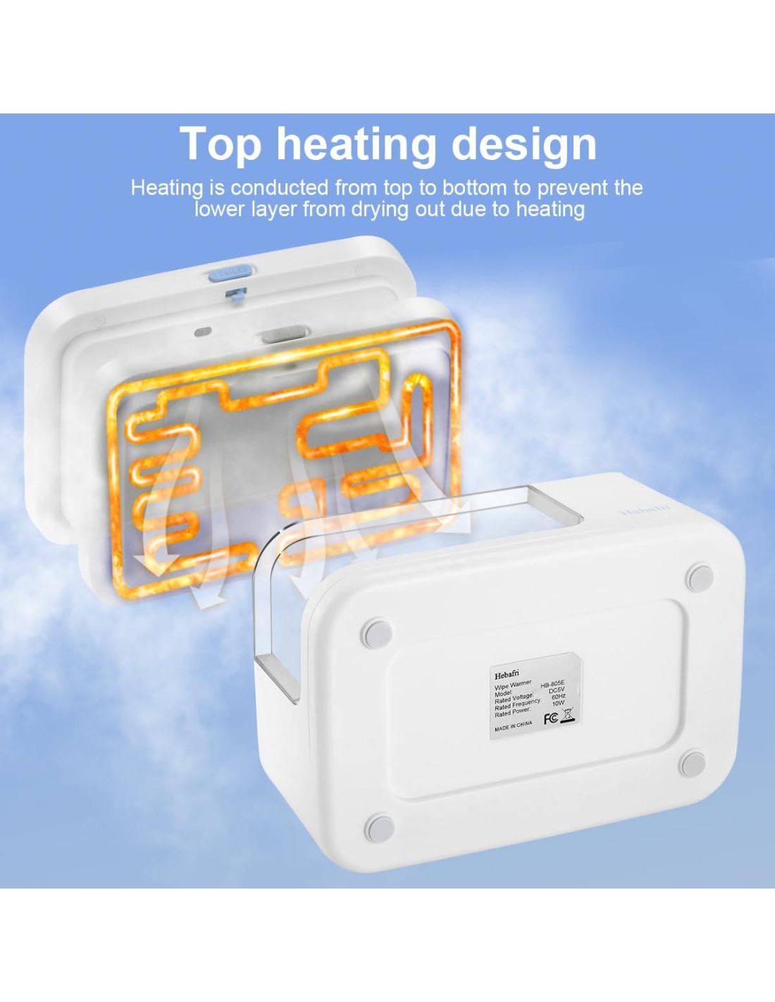 - Diseño de Calentamiento Superior El calentador de toallitas para bebés recién nacidos presenta un diseño de calentamiento superior con una placa de acero inoxidable que conduce el calor de manera uniforme de arriba hacia abajo, asegurando que las toallitas se mantengan tibias y húmedas.