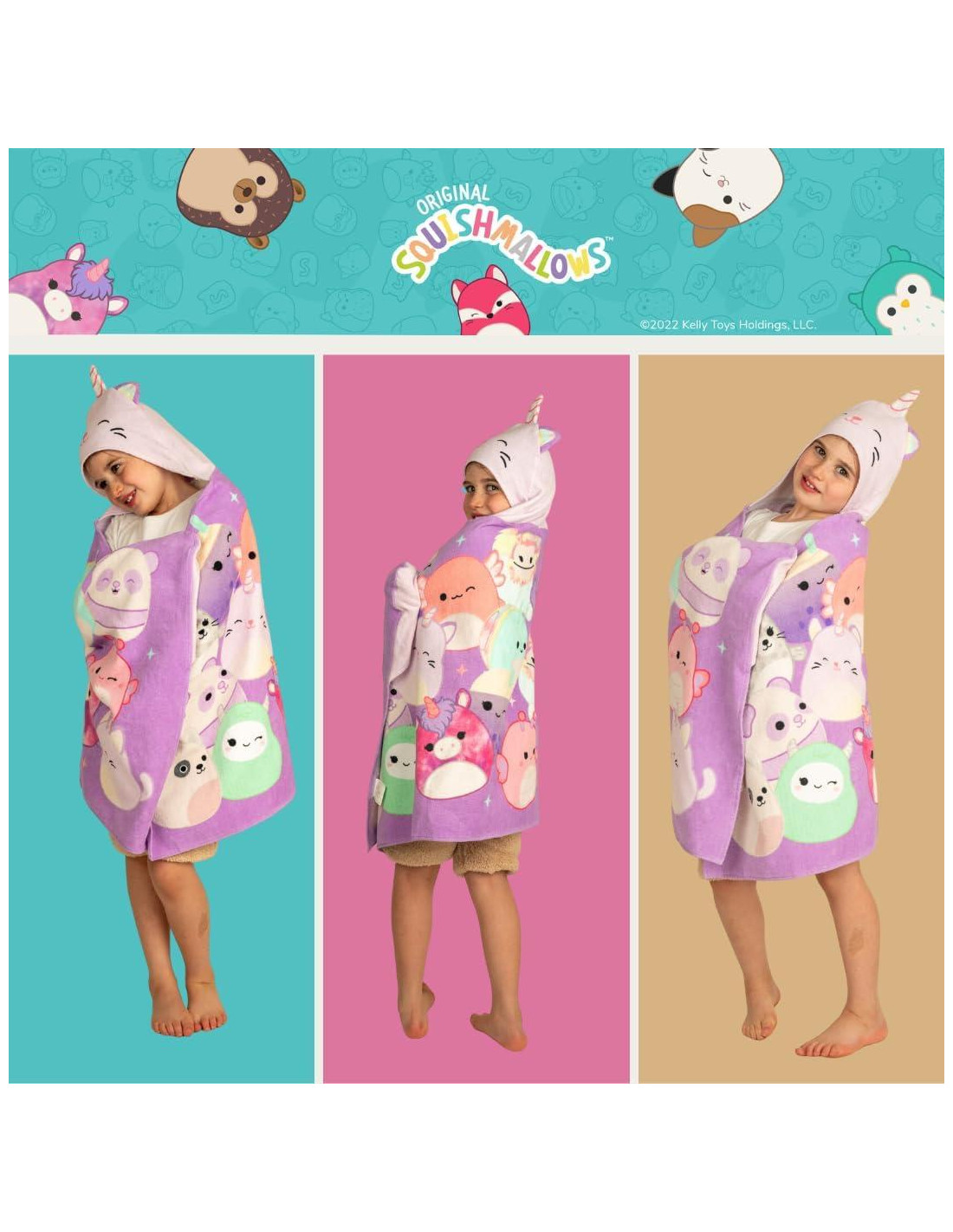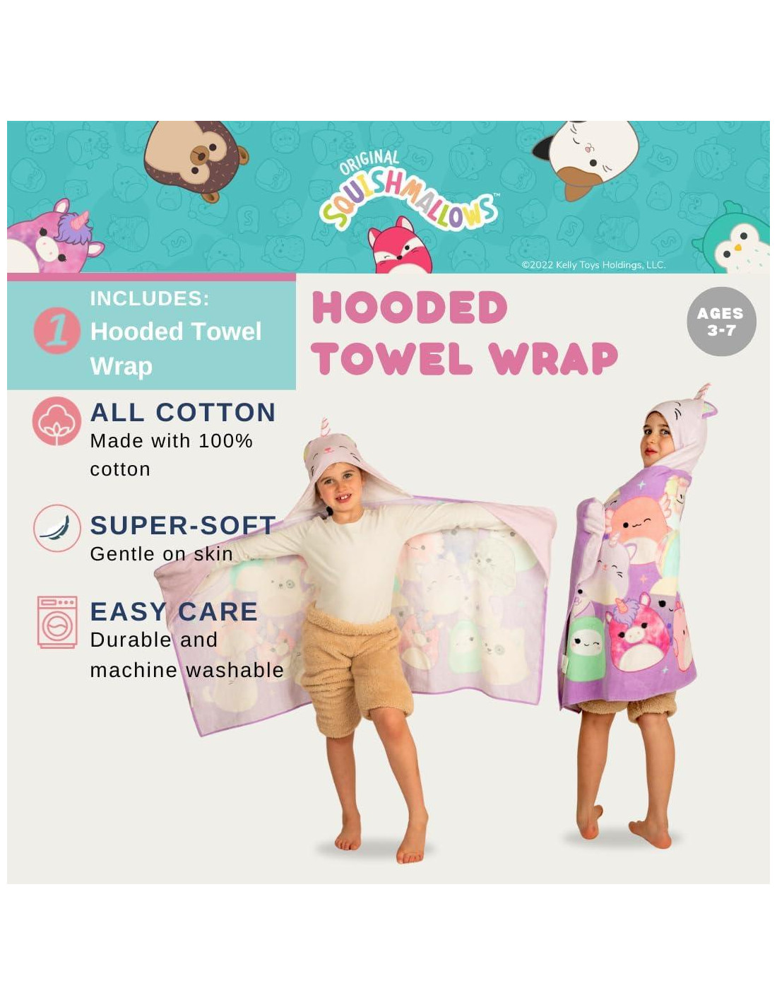 - DISEÑO SQUISHMALLOWS: Lleva los adorables y abrazables Squishmallows a tus rutinas de baño y natación con esta colorida toalla con capucha de patrón "Abrazos para Hoy". Envuelve a tu hijo en comodidad y estilo juguetón con la ayuda de Lola la unicornio y una adorable variedad de Squishmallows.
