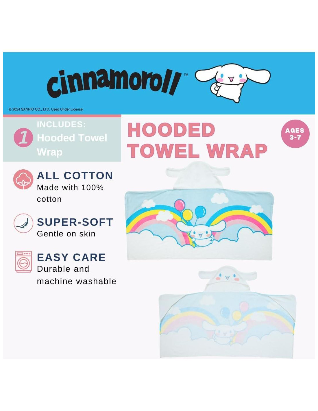 - LA COMPRA INCLUYE: Una toalla con capucha Cinnamoroll que mide 24" (61 cm) (L) x 50" (127 cm) (W). Es lo suficientemente grande para niños en crecimiento de 3 a 7 años.