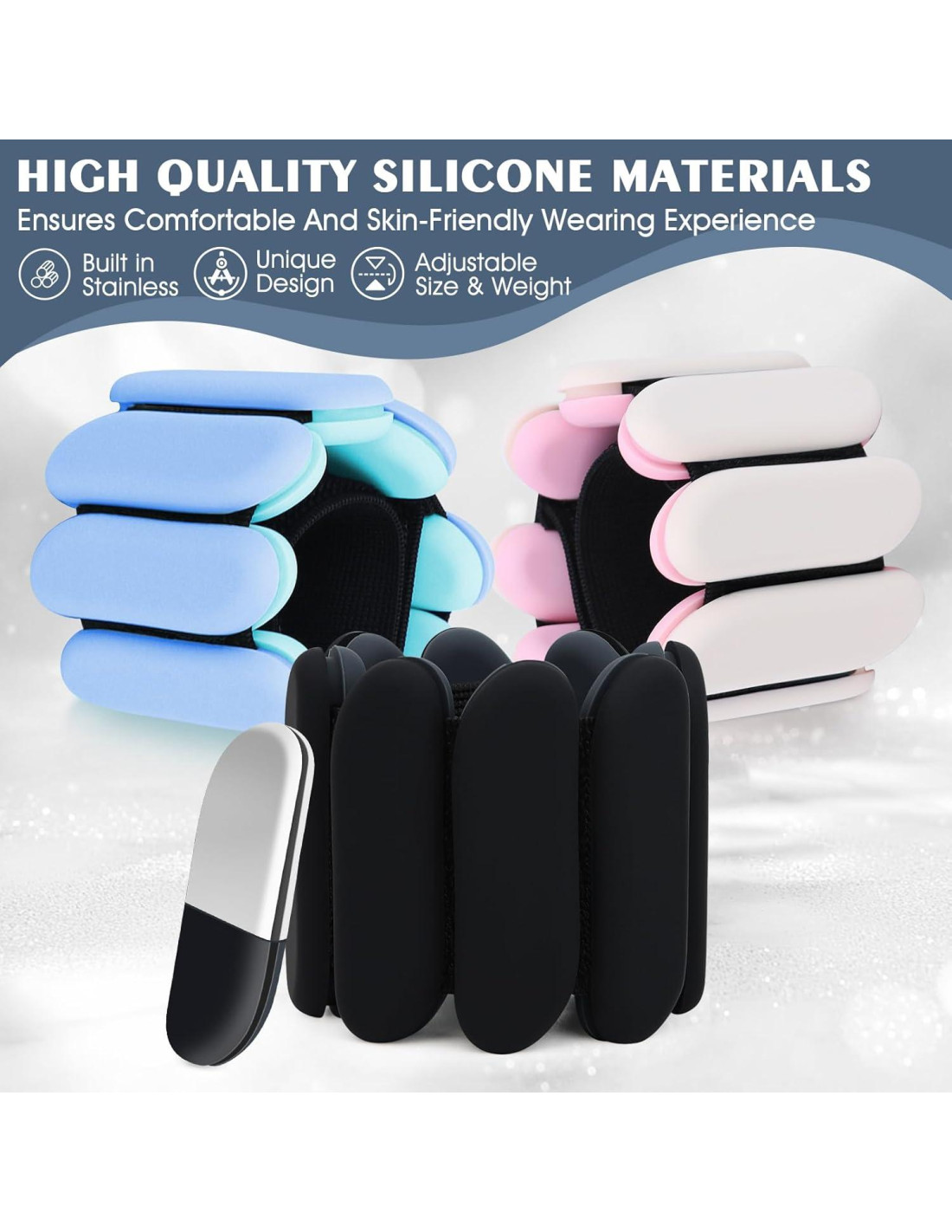 - [ALTA CALIDAD] : Nuestros sets de pesas de muñeca ajustables están hechos de material de silicona suave y cómodo, a prueba de sudor, a prueba de olores, antideslizante. La superficie está cuidadosamente pulida para una piel más cómoda, y el diseño de forma único se ajusta más al movimiento de la muñeca y el tobillo para añadir un toque de elegancia mientras haces ejercicio. Cada carga puede moverse libremente, permitiéndote ajustar el peso de las pulseras, puedes quitar una sección de carga para crear un mejor ajuste, haciéndote más cómodo para disfrutar del deporte.