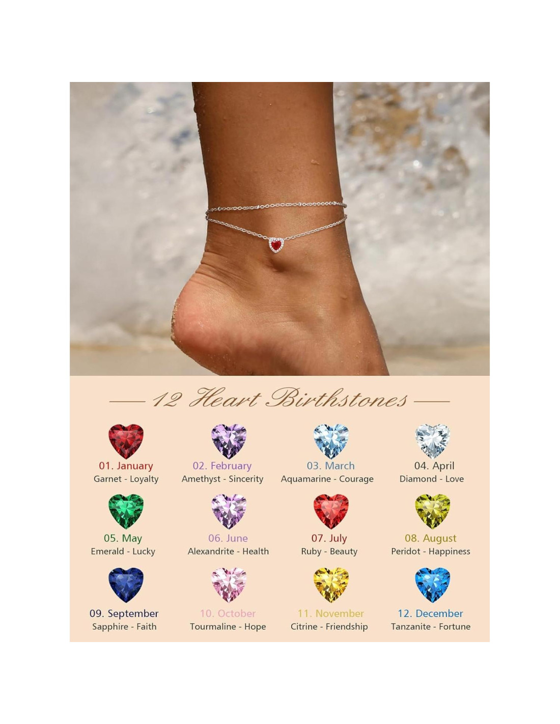 - Tobillera de piedra de nacimiento de doble capa elegante y brillante, elaborada con material de acero inoxidable de alta calidad, perfecta para mujeres que aman los accesorios. Esta pieza estilosa puede complementar sin esfuerzo cualquier calzado, desde pantuflas casuales hasta elegantes tacones altos, añadiendo un toque de encanto a tu atuendo. Lúcela bajo el sol o junto a la playa, y observa cómo tu atractivo brilla.
