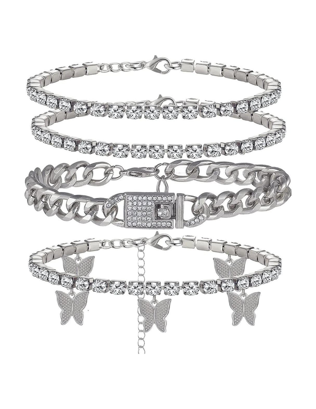 - El conjunto de 4PCS de pulseras de tobillo cubanas incluye 1 pulsera de cadena cubana, 2 pulseras de tobillo de tenis y 1 pulsera de tobillo con encanto de mariposa. Los rhinestones brillan al sol, cuando juegas en la playa, te hacen lucir más atractiva.
