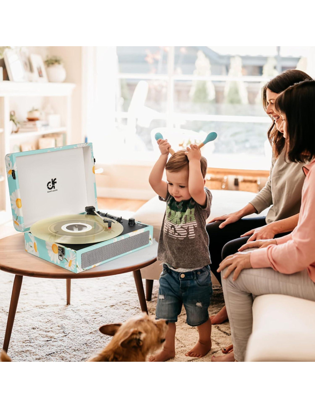 - [SISTEMA DE GIRADISCOS MEJORADO] - El reproductor de discos portátil cuenta con un giradiscos de correa y cuatro pies aislantes para prevenir vibraciones. El brazo flexible levanta la aguja adecuadamente y la deja caer muy silenciosamente sobre el disco. Sin saltos.