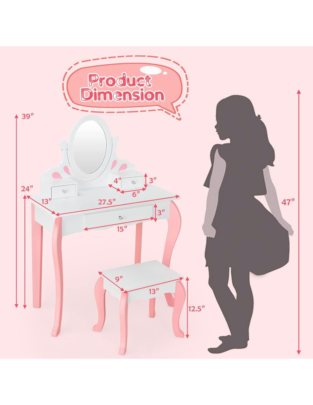 - Uso Dual con Parte Superior Desmontable: La parte superior de esta mesa de maquillaje de juego de simulación se puede mover, por lo que tu hijo puede usar esta mesa como un escritorio para leer libros, dibujar, comer bocadillos o jugar. Además, el taburete a juego le da a tu hijo un lugar estable para sentarse y se puede guardar debajo de la mesa cuando no está en uso para ahorrar espacio.