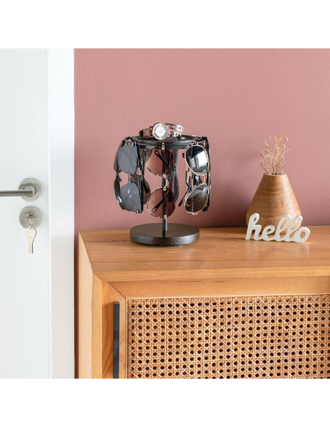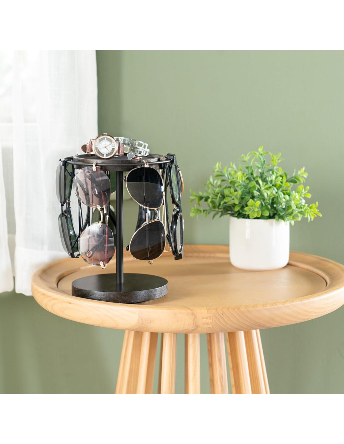 Este organizador de gafas de sol con Rotación de 360 puede sostener hasta 12 pares de gafas en un solo lugar central de manera ordenada, y tiene una bandeja adicional como organizador de joyas, equipada con almohadillas suaves para almacenar relojes, pulseras y anillos sin rayar.