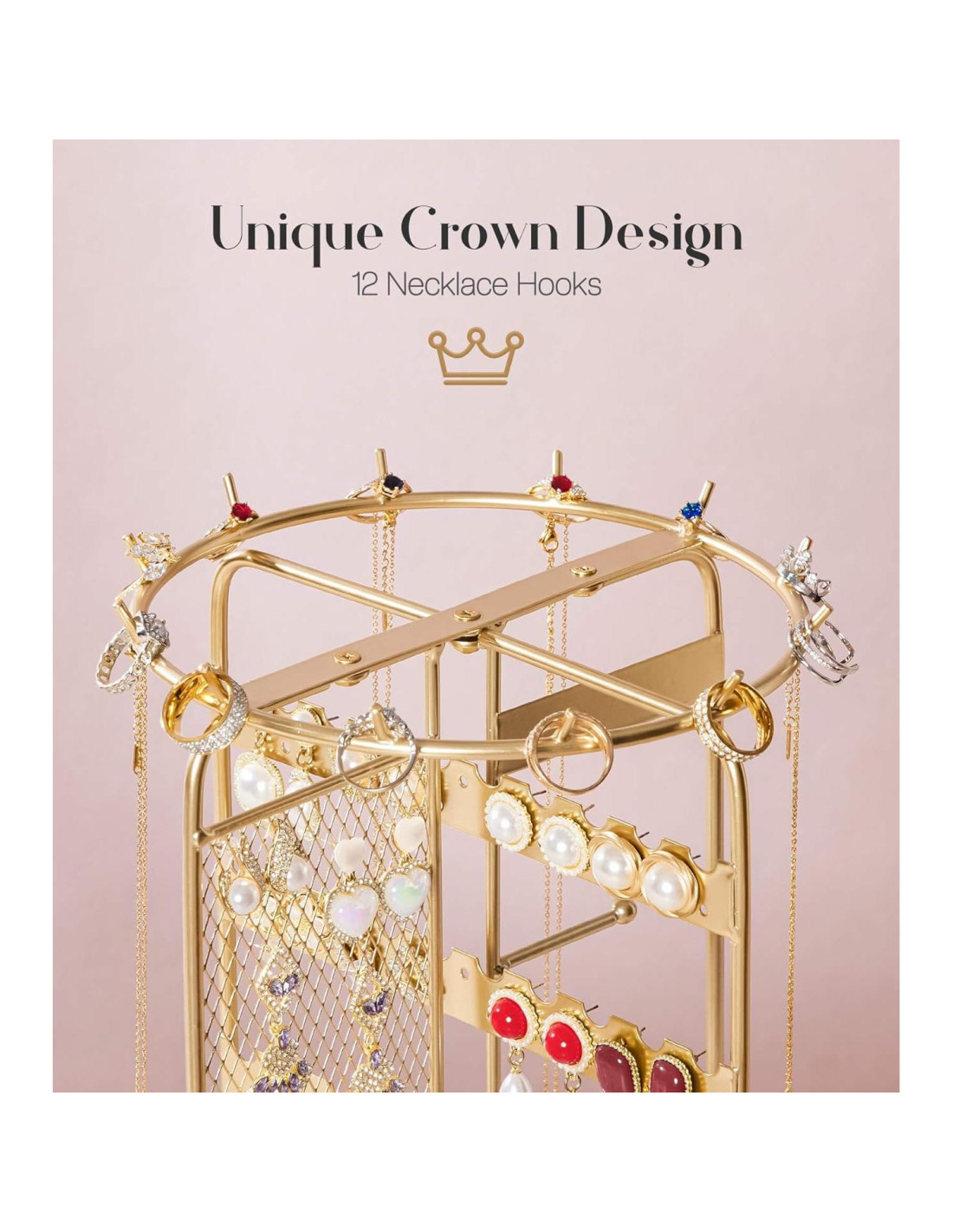 - Soporte Organizador de Joyería Rotatorio 360: Probado para girar suavemente durante más de 10,000 ciclos, este soporte de joyería puede girar sin esfuerzo, lo que facilita colgar o exhibir tu colección de joyas.