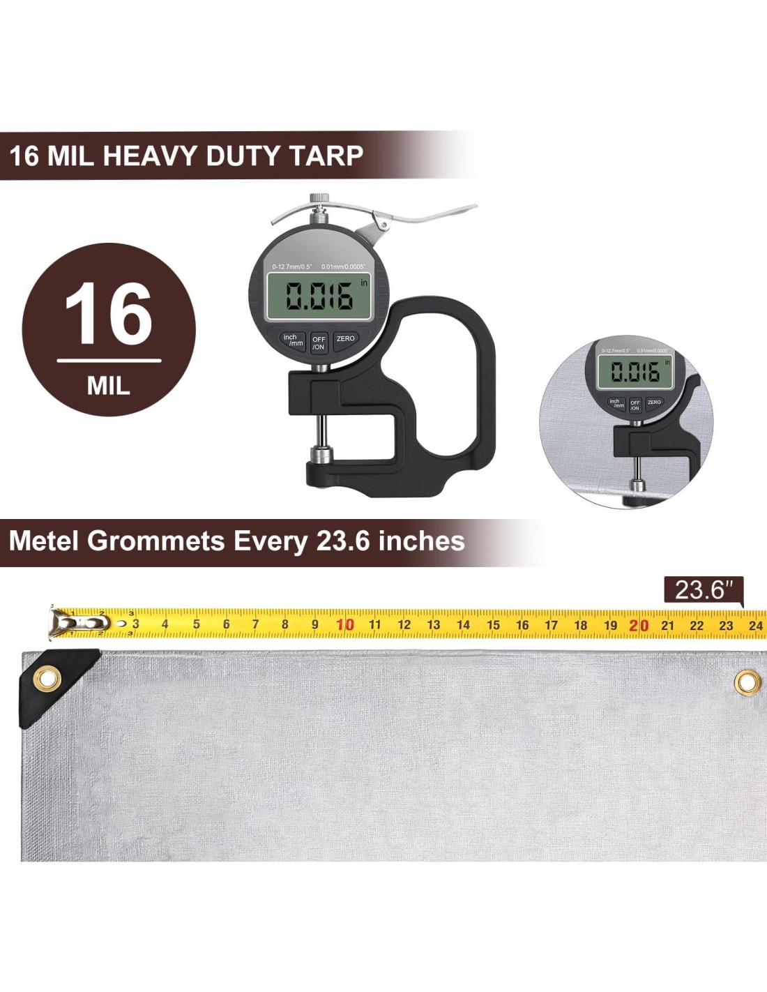 - Tamaño Final: La lona resistente tiene un grosor de 16 mil, 8oz por yarda cuadrada. Esta lona resistente al agua tiene la fuerza y durabilidad que necesitas. El tamaño de la lona para lluvia es el tamaño final, lo que significa que cuando eliges tu tamaño obtienes las lonas de tamaño completo y no es más corta unos centímetros de ambos lados como otras compañías
