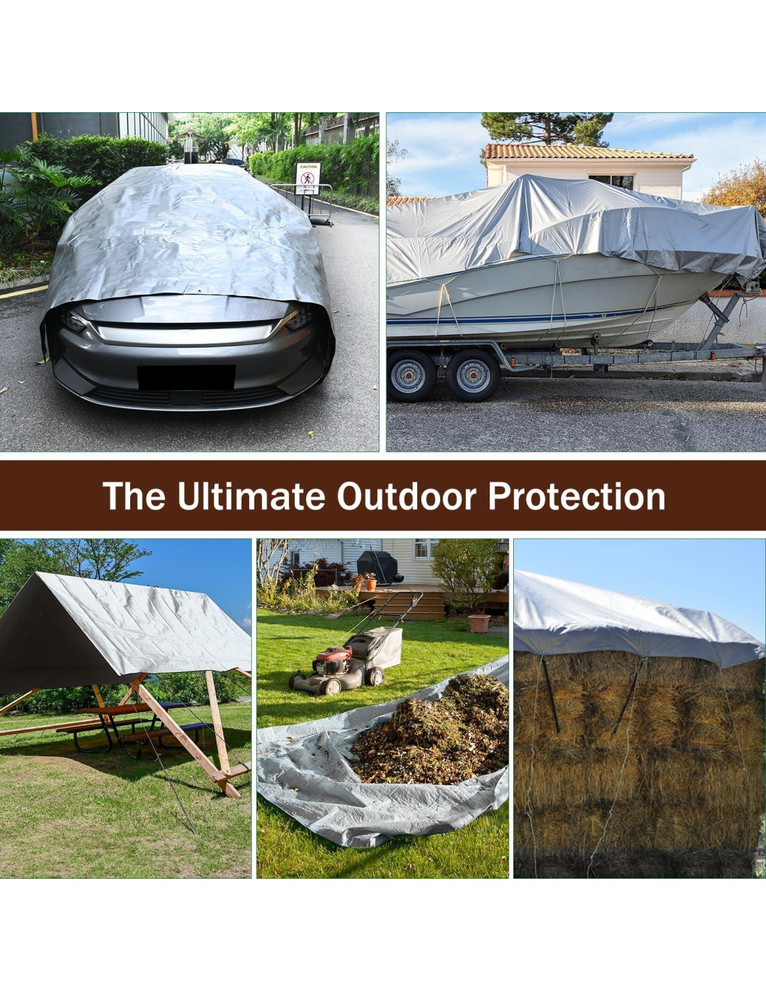 - Multipropósito: Podemos usar estas lonas para cubrir barcos, camiones, automóviles, vehículos de motor, equipos industriales o agrícolas, muebles de patio al aire libre, parrillas, piscinas en el patio trasero, estacas, casas rodantes para una protección máxima. También se pueden usar al aire libre para acampar, cazar, convertirla en un toldo o una lona de tienda