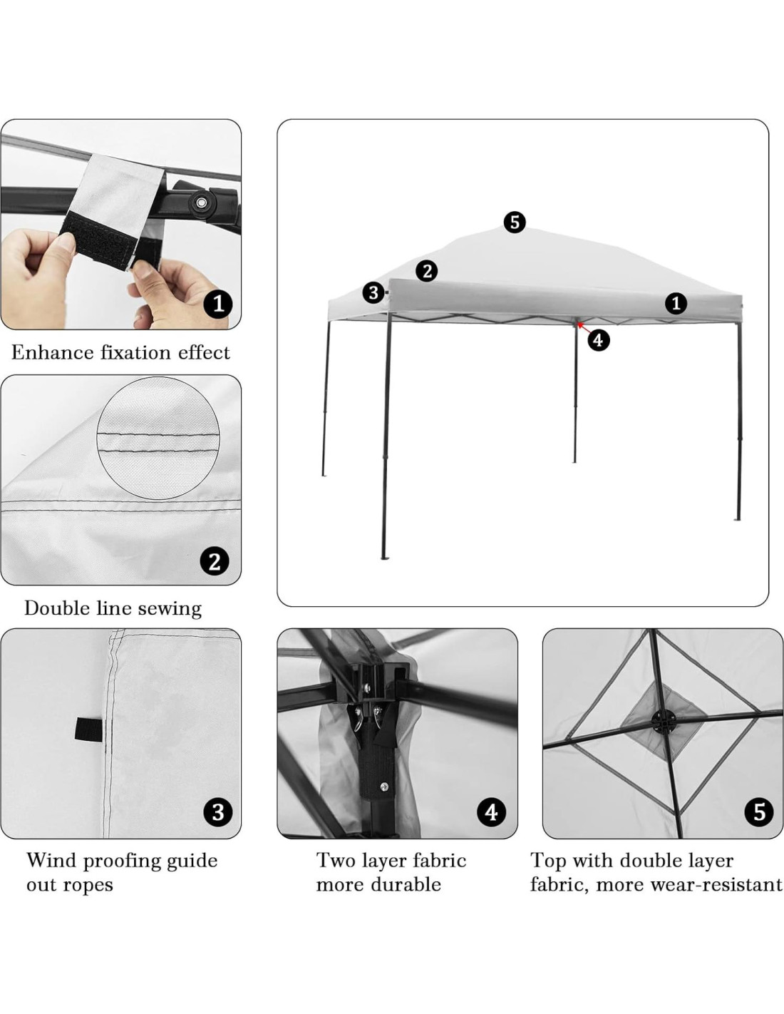 - Colores disponibles: Ofrecemos muchos colores hermosos para la cubierta de repuesto del toldo, puedes elegir como desees. Por ejemplo, proporcionamos blanco, negro, gris, azul, beige, etc. Perfecto para uso comercial o recreativo, como ferias comerciales, eventos al aire libre, camping, picnics, fiestas, BBQ, eventos deportivos, artes, etc.