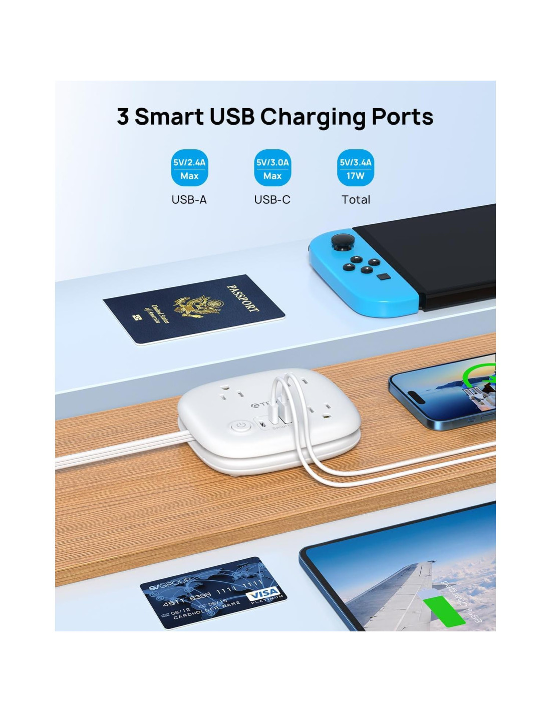Diseñado específicamente para viajar, se puede plegar a un tamaño compacto con un cable enrollado alrededor. Permite cargar en puertos para tu teléfono mientras las laptops de tus compañeros de trabajo están enchufadas. Las 3 salidas AC y los puertos USB están dispuestos en un cuadrado, lo que aumenta la distancia entre las salidas y es perfecto para enchufar adaptadores de corriente grandes sin bloquear otras salidas. Ofrece una solución para enchufar el cable de extensión en un espacio reducido y colocar tu cama, muebles, armario y mesita de noche contra la pared. El cable de extensión plano añade un interruptor de encendido/apagado que proporciona una mayor protección contra sobrecargas de energía y también facilita la gestión de la energía. Esta regleta tiene un diseño de fijación con tornillo en la parte posterior, puedes montarla en una pared o fijarla fácilmente en el escritorio. DIY todo tipo de aplicaciones para esta regleta. Enrolla el cable alrededor del enchufe y empácalo en una maleta, lo que abre un montón de espacio. Se enrolla de nuevo al mismo tamaño fácilmente después de su uso, puedes llevarlo fácilmente a todas partes. Regleta de Enchufe con Cable Enrollado Regleta de Enchufe con Cable Enrollado Regleta de Viaje 2 en 1 Regleta de Enchufe Retráctil Regleta de Enchufe Plano Extensor de Enchufe Giratorio