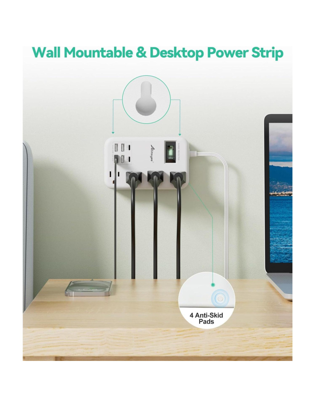 - Montable en Pared y Toma de Corriente de Escritorio - Este protector de sobretensión montado en la pared tiene un diseño de 2 agujeros de montaje que permite instalar de forma segura este protector de sobretensión de cable de extensión plano, incluyendo detrás del televisor, al lado de la cama, baño, lavandería, banco de trabajo, garaje o debajo del gabinete. Diseño de 4 almohadillas antideslizantes en la parte inferior, mejor para el escritorio.