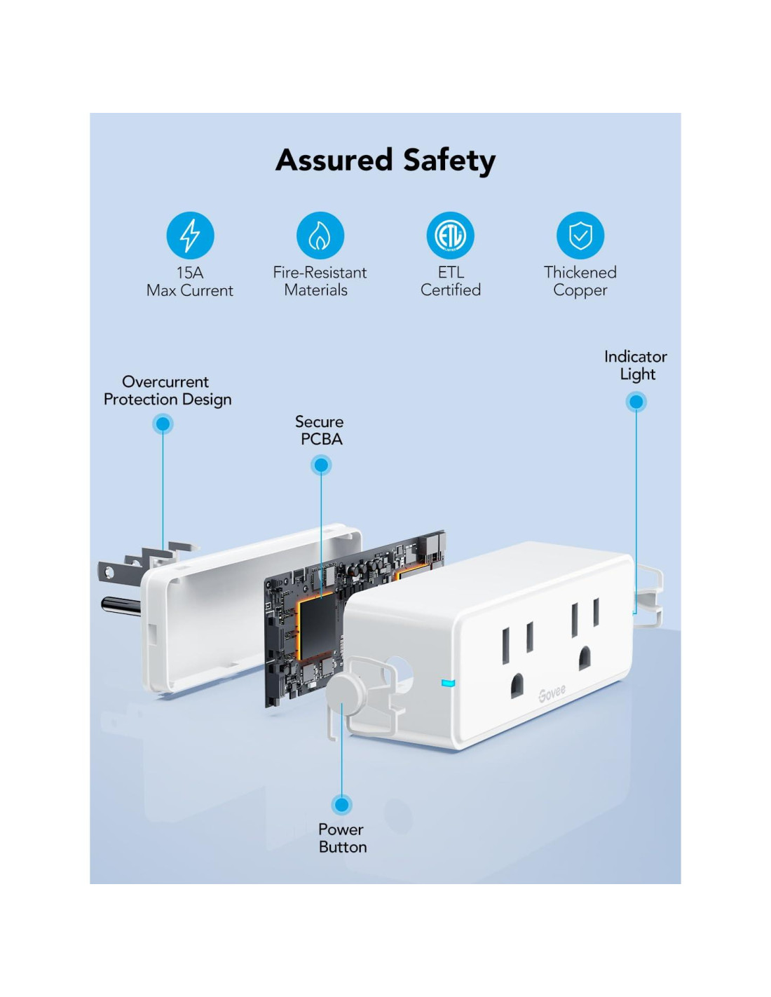 - Control de Voz Inteligente: Compatible con Alexa y Asistente de Google para control manos libres de encendido/apagado de tus dispositivos y electrodomésticos conectados. Nota: Los usuarios deben crear una nueva cuenta en la App Govee Home o estar conectados para usar este Enchufe Wi-Fi.