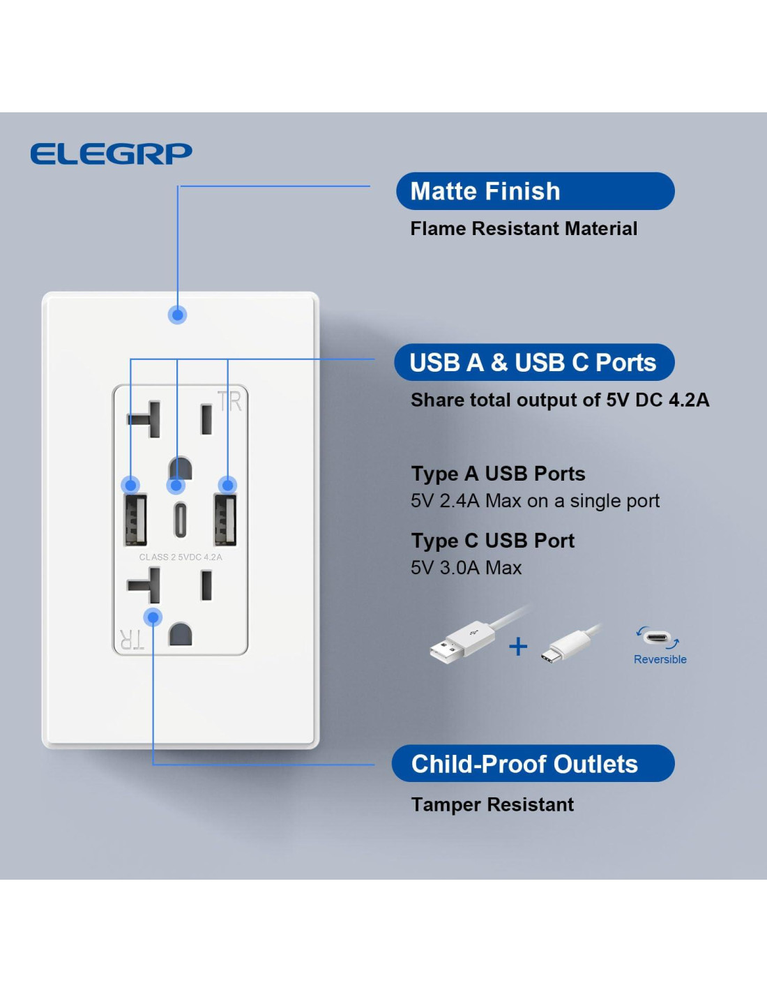 - [Diseño Duradero] Materiales resistentes al fuego y persianas a prueba de niños garantizan seguridad. Puerto USB C probado para 10,000 inserciones, USB A para 8,000. Certificado por FCC, UL y cUL.