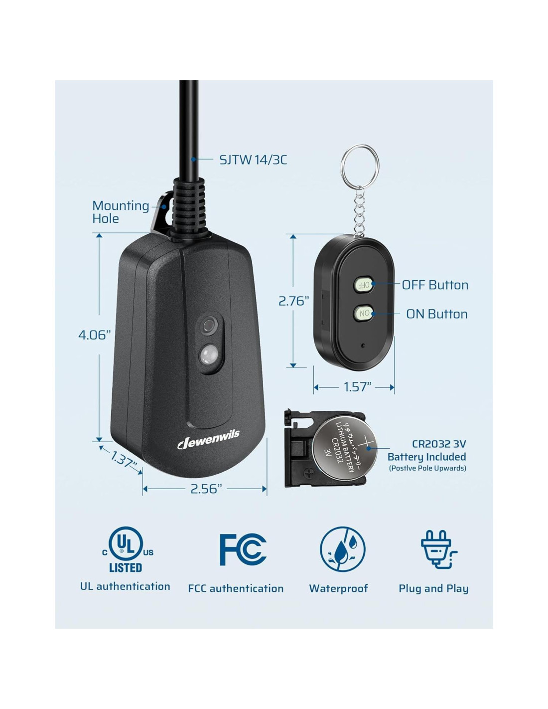 - [ Enchufe Remoto de Alta Resistencia ] Hasta 15A / 1875W Resistivo, 1000W Tungsteno, 1/2HP; enciende/apaga remotamente luces de cadena, decoraciones navideñas, accesorios de iluminación paisajística, seguridad y otros electrodomésticos con solo presionar un botón desde dentro de la casa
