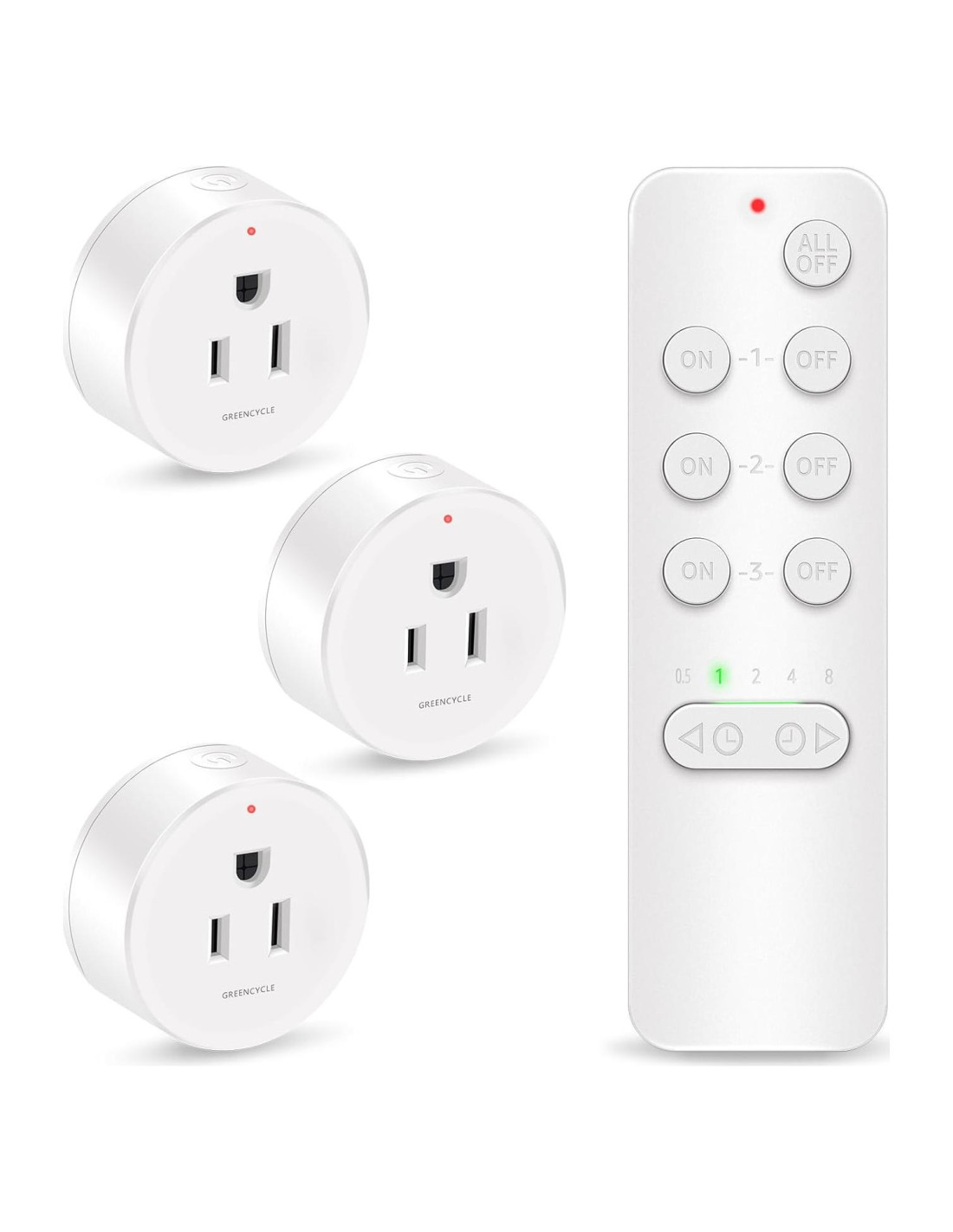 - [Ahorro de Energía y Seguridad] Certificado por CE, FCC, RoHS, CQC, TUV, IP66, V0. Permanece apagado después de un corte de energía. La batería en el interruptor de control remoto inalámbrico dura 10 años sin signos de agotamiento. El enchufe pasó pruebas de 400K ciclos de conmutación. También soporta tecnología de disparo de cruce cero, protección contra sobretensiones, cortocircuitos, sobrecargas y sobrecorrientes. Los enchufes de control remoto Greencycle hacen tu vida más conveniente, segura y eficiente en energía.