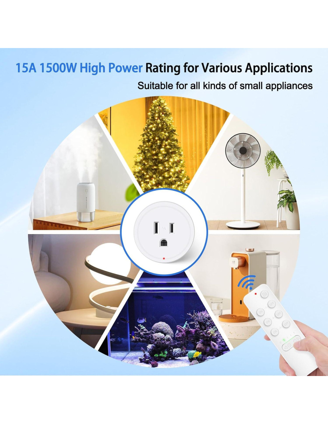 - [Rango de Control de 500FT] Enchufe de control remoto interior de 15A/1500W con temporizador funciona con la mayoría de los electrodomésticos del hogar: luces, hornos eléctricos, ventiladores, calefactores, televisores, humidificadores, hervidores, arroceras y más. Su potente señal RF de 433.92 MHz penetra paredes y puertas, con un rango de hasta 500 pies (152.4 metros) en áreas abiertas. El sistema opera sin interferir con otros dispositivos electrónicos del hogar.