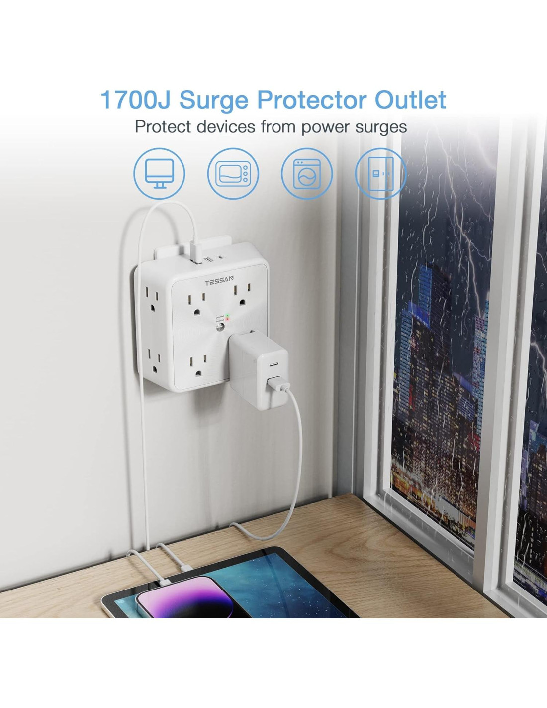 - Enchufe Protector de Sobretensión: Extensor de enchufe múltiple con una clasificación de energía de 1700 julios puede proteger tus costosos computadoras, TV y otros dispositivos de ataques de sobretensión que podrían ser causados por picos o sobrecargas.