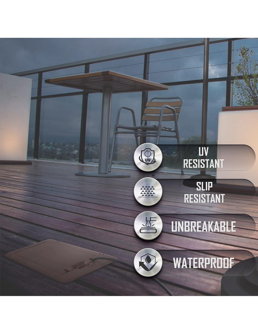 - Proporciona acceso conveniente a la energía en decks y porches de madera o compuestos elevados