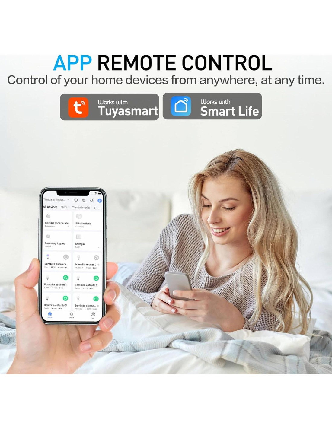 - Control Remoto a través de la App - Dondequiera que estés, todo lo que necesitas hacer es tomar tu teléfono, y puedes controlar los electrodomésticos. Cuando estés en la oficina y de repente te des cuenta de que olvidaste apagar el humidificador en casa, no te preocupes. Con solo un toque suave en las apps 'Smart Life' y 'Tuyasmart', puedes apagarlo. En tu camino a casa desde el trabajo, puedes preestablecer el calentador eléctrico conectado al enchufe inalámbrico, para que sientas el calor tan pronto como llegues a casa.