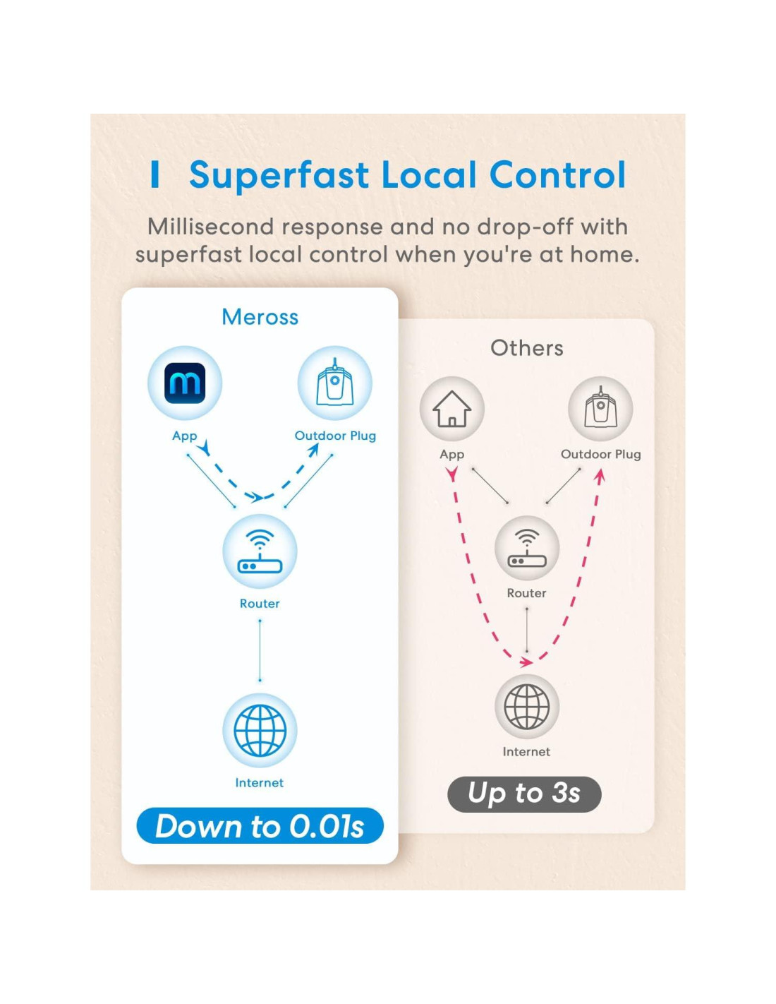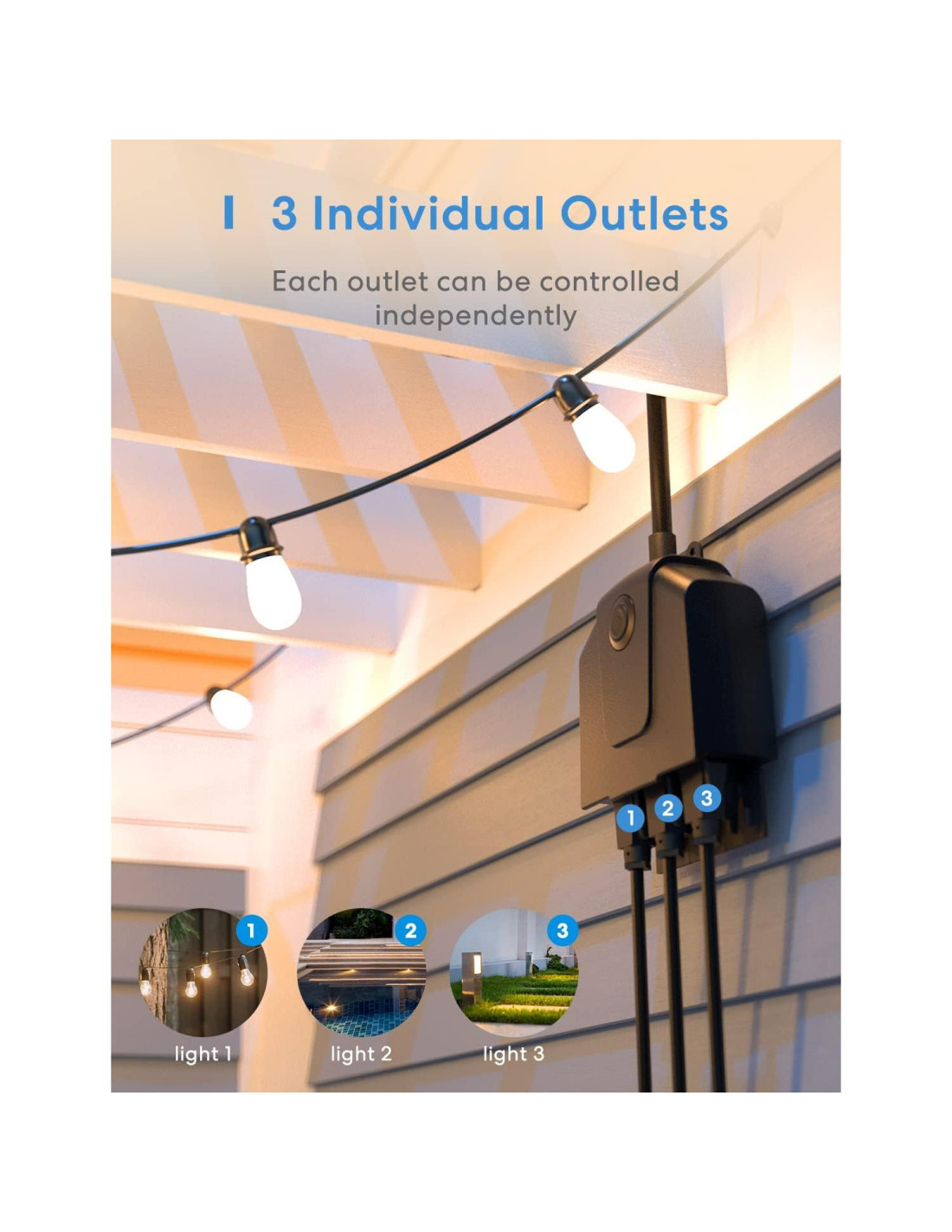 - Diseño de 3 Tomas Independientes: Equipado con 3 tomas controladas individualmente. 3 tomas FUNCIONAN INDEPENDIENTEMENTE entre sí. Alimentado por el chipset Mediatek IoT, el enchufe inteligente para exteriores de meross tiene un rango de conexión Wi-Fi más largo y una tasa de desconexión más baja. Asegúrate de conectar tu teléfono a la red Wi-Fi de 2.4GHz mientras configuras el enchufe Wi-Fi para exteriores.