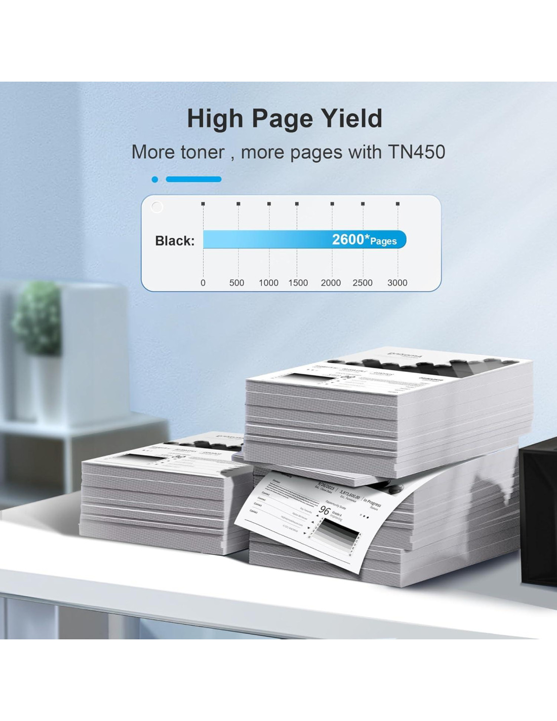 - Rendimiento de Páginas: Negro es 2,600 páginas por tóner tn450 tn-450 (5% de cobertura)