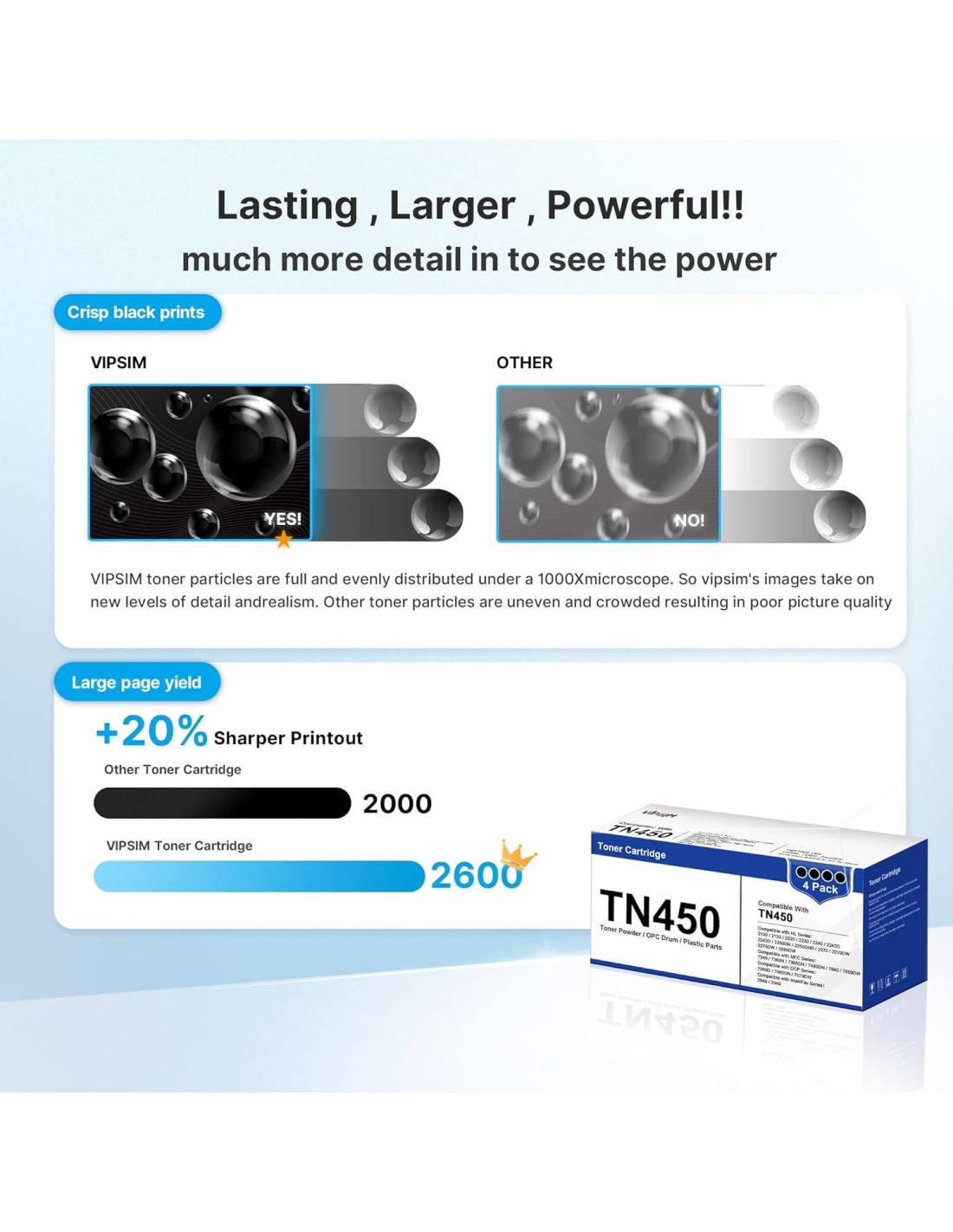 - TN450 Compatible con Impresora: Brother 7060D, 7065D, HL-2130, HL-2132, HL-2220, HL-2230, HL-2240, HL-2240D, HL-2242D, HL-2250DN, HL-2270DW, HL-2275DW, HL-2280DW, Intellifax 2840, Intellifax 2940, 7240, 7360N, 7365DN, 7460DN, 7860DW.