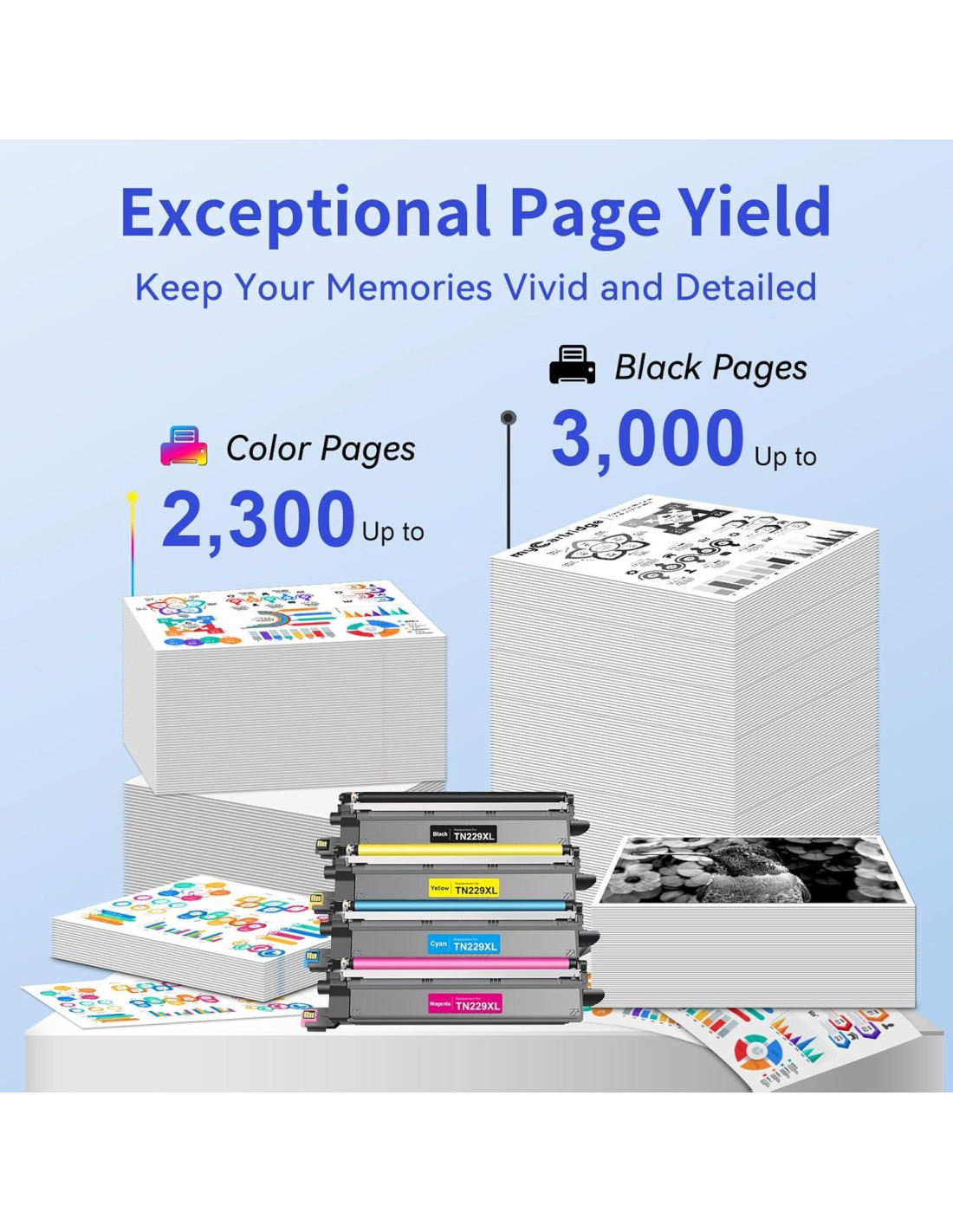 - Rendimiento Estimado de Páginas Altas: Hasta 3,000 páginas por tóner negro de alto rendimiento TN229XLBK, hasta 2,300 páginas por cartuchos de tóner de alto rendimiento TN229 TN229XL cian/magenta/amarillo (basado en 5% de cobertura)