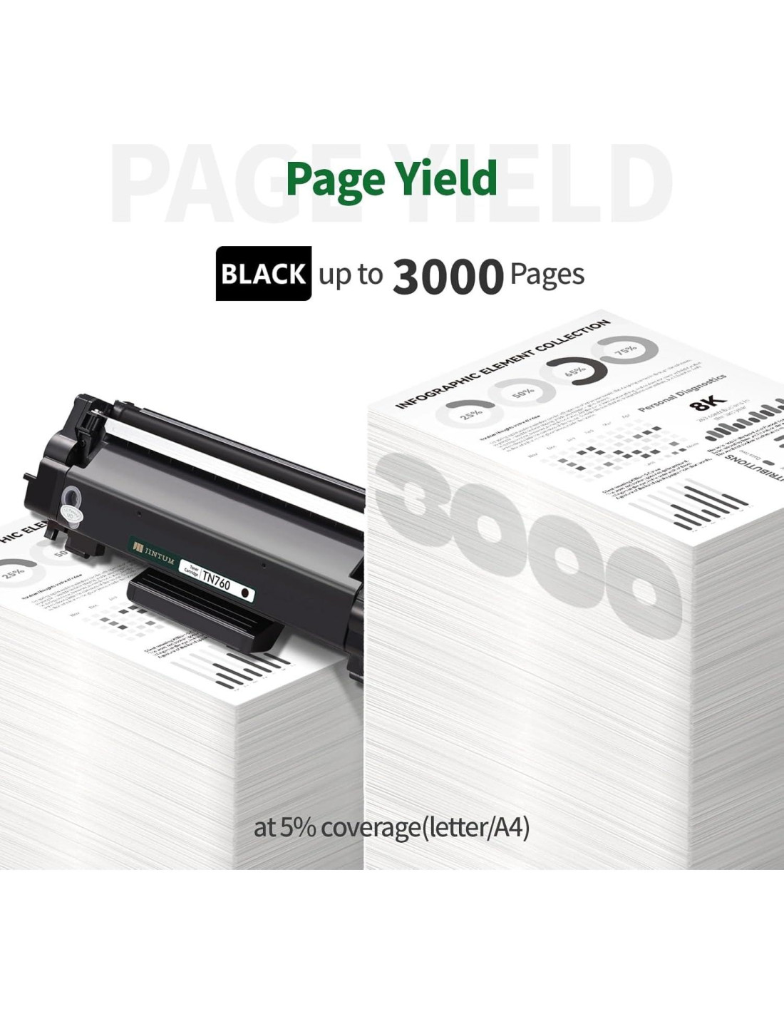 - Rendimiento de páginas: el cartucho de tóner negro TN-760 de alto rendimiento es de hasta 3000 páginas por cartucho con una cobertura del 5% (carta/A4)